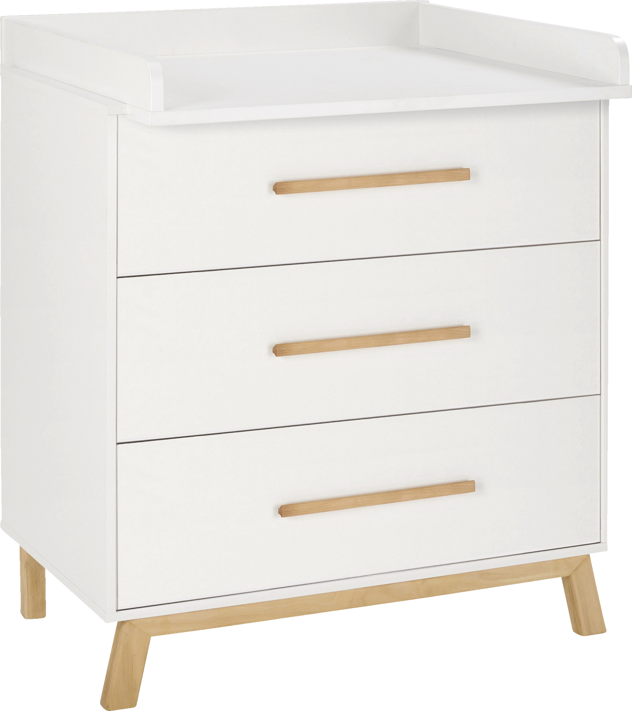 - VENICE Wickelkommode: Dekor weiß, 3 Schübe mit Selbsteinzug und extra starken seitlichen Führungsschienen, Buche Fußgestell und Griffe aus Massivholz Buche geölt; Wickelaufsatz abnehmbar Wickelhöhe: 94 cm; H: 102 cm B: 90 cm T: 53/70 cm