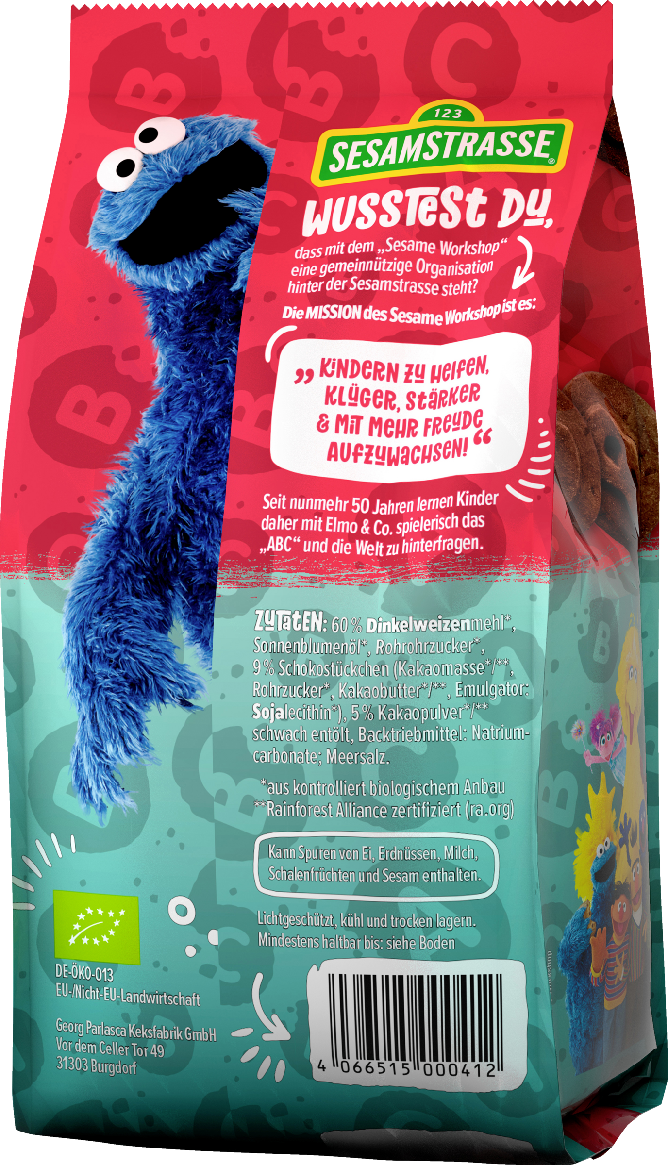 60% DINKELWEIZENMEHL*, Sonnenblumeöl*, Rohrohrzucker*, 9% Schokostückchen (Kakaomasse*/**, Rohrzucker*, Kakaobutter*/**, Emulgator: SOJALECITHIN*), 5 % Kakaopulver*/** schwach entölt, Backtriebmittel: Natriumcarbonate; Meersalz. *aus kontrolliert biologischem Anbau **Rainforest Alliance-zertifiziert (www.ra.org)