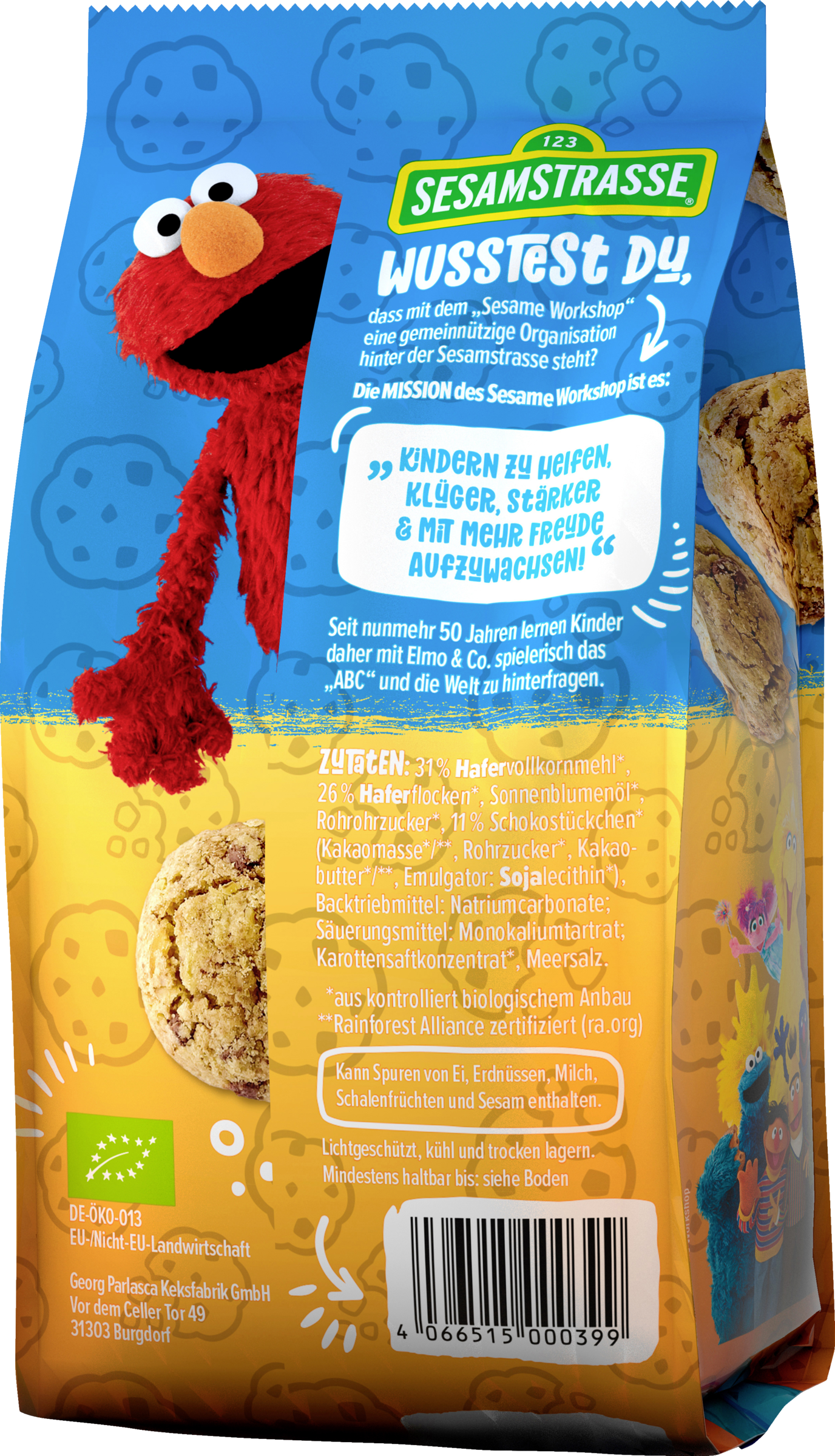 Die SESAMSTRASSE Krümelmonster Cookies mit Schokostückchen sind in Bio-Qualität, mit Vollkorn und haben nur so viel Zucker wie nötig.