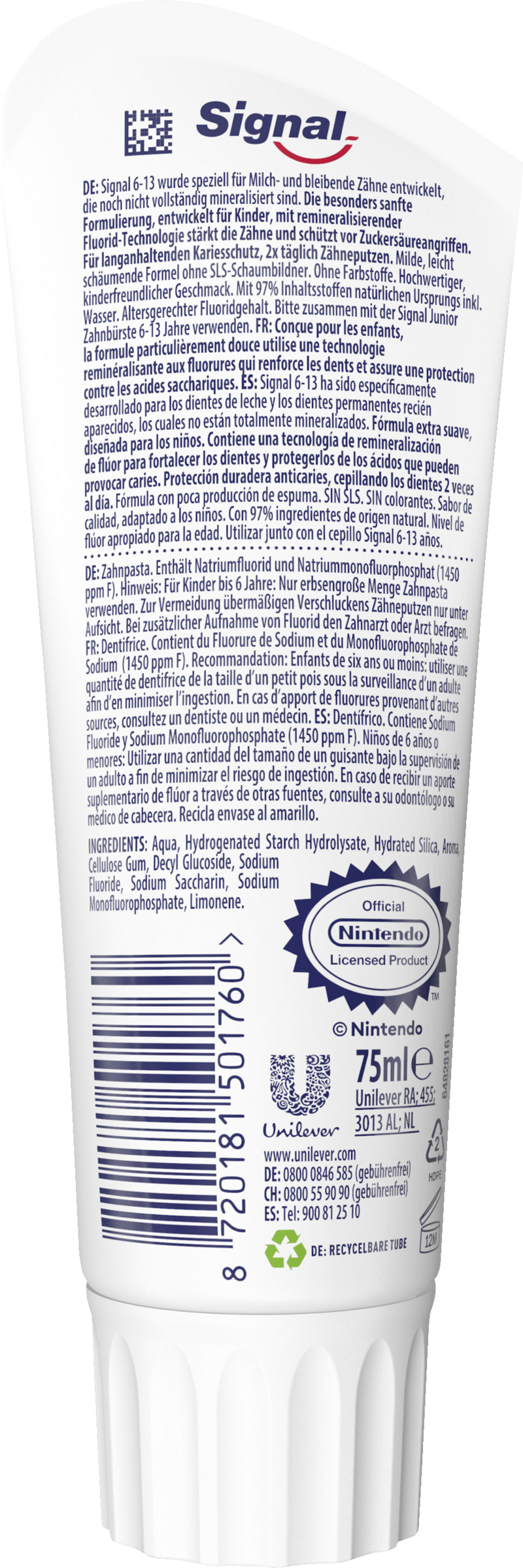 Signal 6-13 wurde speziell für Milch- und bleibende Zähne entwickelt, die noch nicht vollständig mineralisiert sind.Die besonders sanfte Formulierung, entwickelt für Kinder, mit neuer remineralisierender Fluorid-Technologie stärkt die Zähne und schützt vor Zuckersäueangriffen.