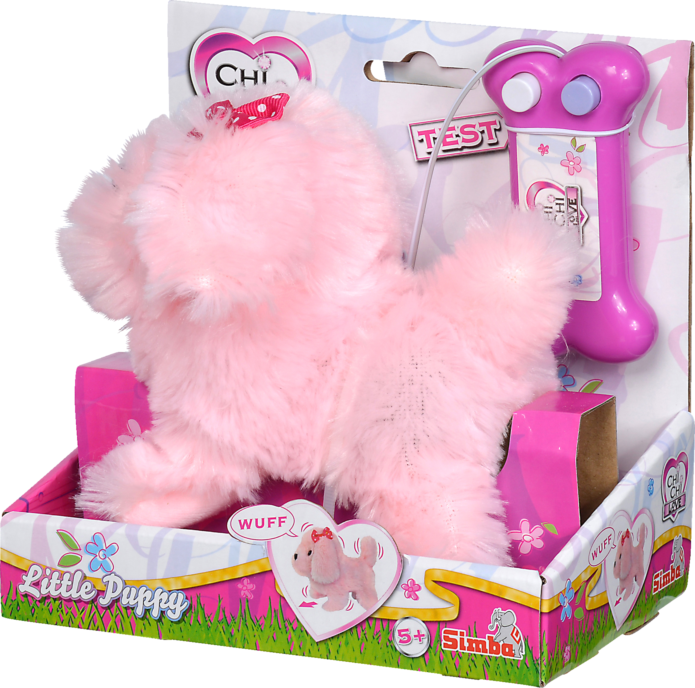 Der süße ChiChi LOVE Puppy ist kabelgesteuert und besitzt zwei Funktionen. Das niedliche rosa Hündchen kann laufen, bellen und mit dem Schwanz wackeln. Mit der Fernbedienung in Hundeknochenoptik können kleine Hundebesitzerinnen die verschiedenen Funktionen ausprobieren.