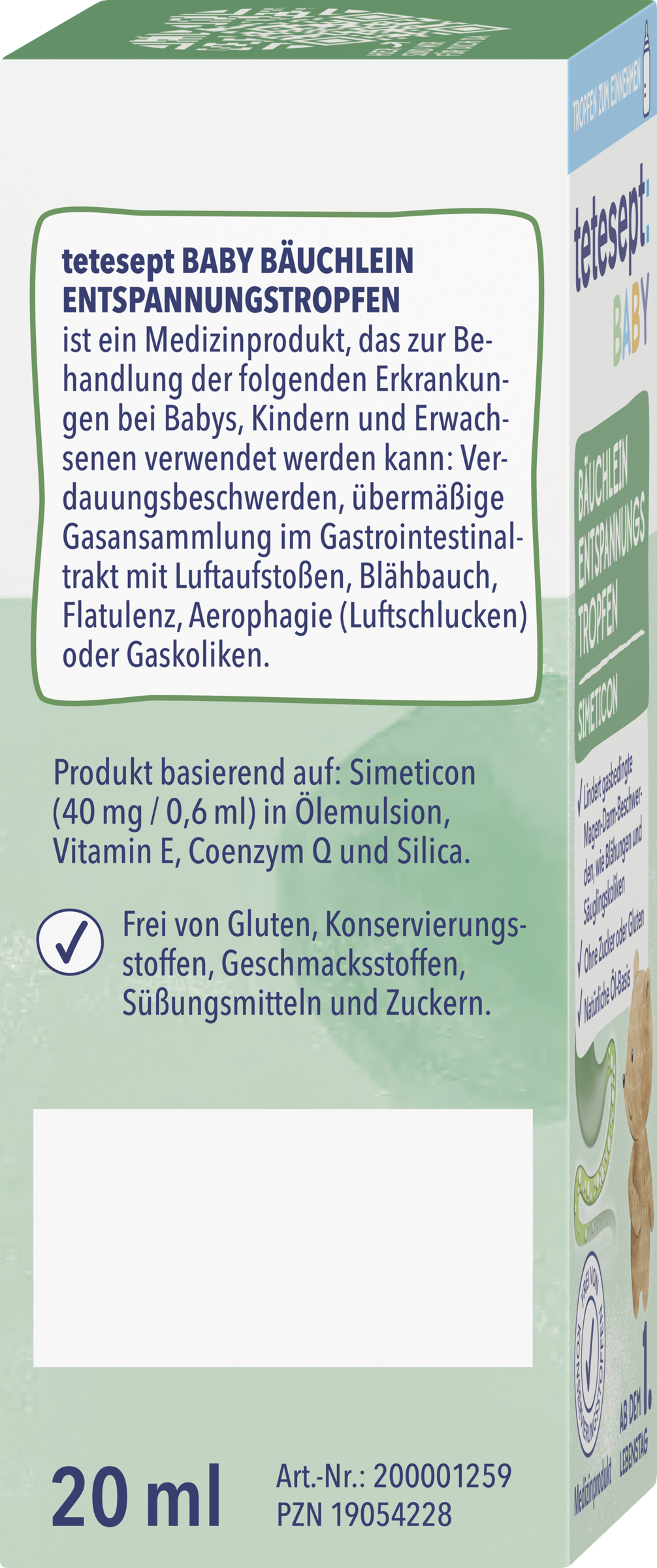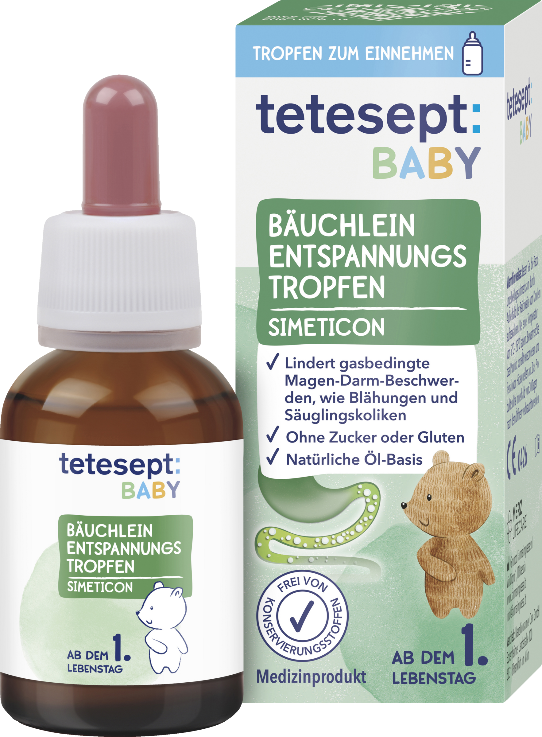 tetesept Baby Bäuchlein Entspannungstropfen ist ein Medizinprodukt, das zur Behandlung der folgenden Erkrankungen bei Babys, Kindern und Erwachsenen verwendet werden kann: Verdauungsbeschwerden, übermäßige Gasansammlung im Gastrointestinaltrakt mit Luftaufstoßen, Blähbauch, Flatulenz, Aerophagie (Luftschlucken) oder Gaskoliken. Ab dem 1. Lebenstag.