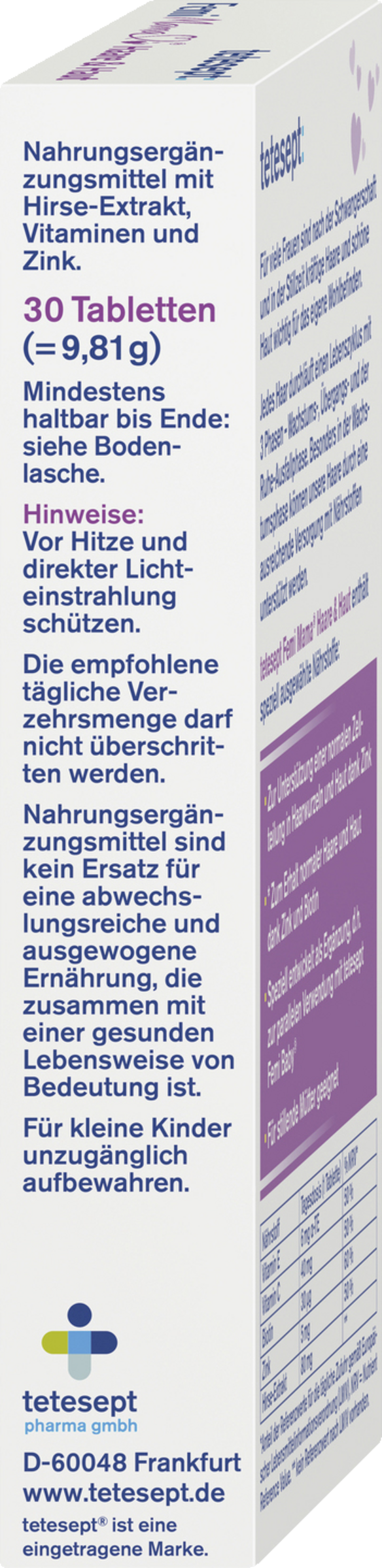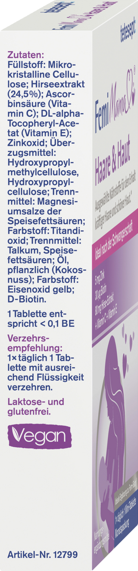 tetesept Femi Mama® Haare & Haut ideal nach der Schwangerschaft für den Erhalt kräftiger Haare und schöner Haut. tetesept Femi Mama® Haare & Haut enthält speziell ausgewählte Nährstoffe zur Unterstützung einer normalen Zellteilung in Haarwurzeln und Haut dank Zink. Zum Erhalt normaler Haare und Haut dank Zink und Biotin. Speziell entwickelt als Ergänzung, d.h. zur parallelen Verwendung mit tetesept Femi Baby®.