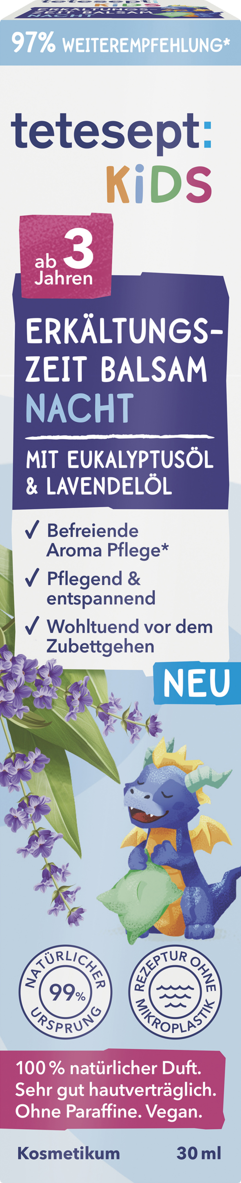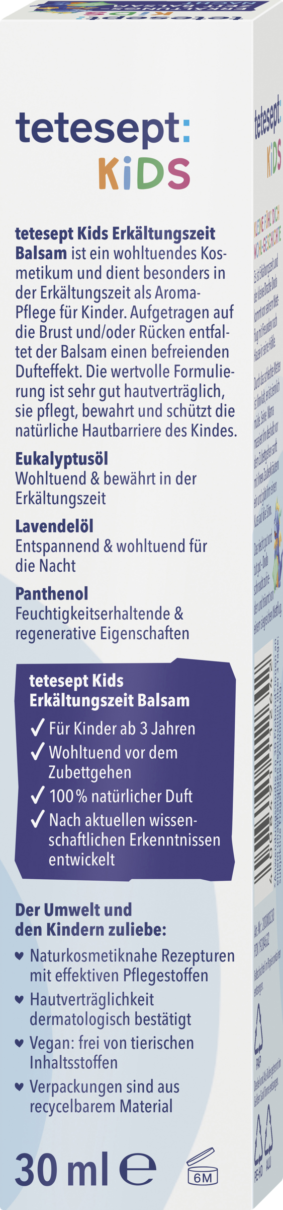 Kids Erkältungszeit Balsam ist ein wohltuendes Kosmetikum und dient besonders in der Erkältungszeit als Aroma-Pflege für Kinder. Aufgetragen auf die Brust und/oder Rücken entfaltet der Balsam einen befreienden Dufteffekt. Die wertvolle Formulierung ist sehr gut hautverträglich, sie pflegt, bewahrt und schützt die natürliche Hautbarriere des Kindes.