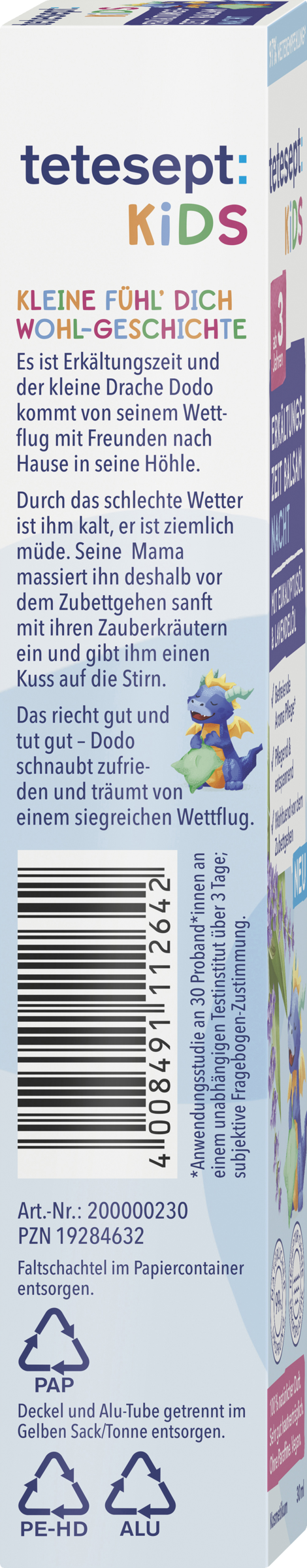 Nur zur äußeren Anwendung. Bei Bedarf eine erbsengroße Menge auf Rücken und/oder Brust des Kindes sanft einmassieren. Nicht im direkten Gesicht- und Nasenbereich und nicht auf geschädigter Haut anwenden.