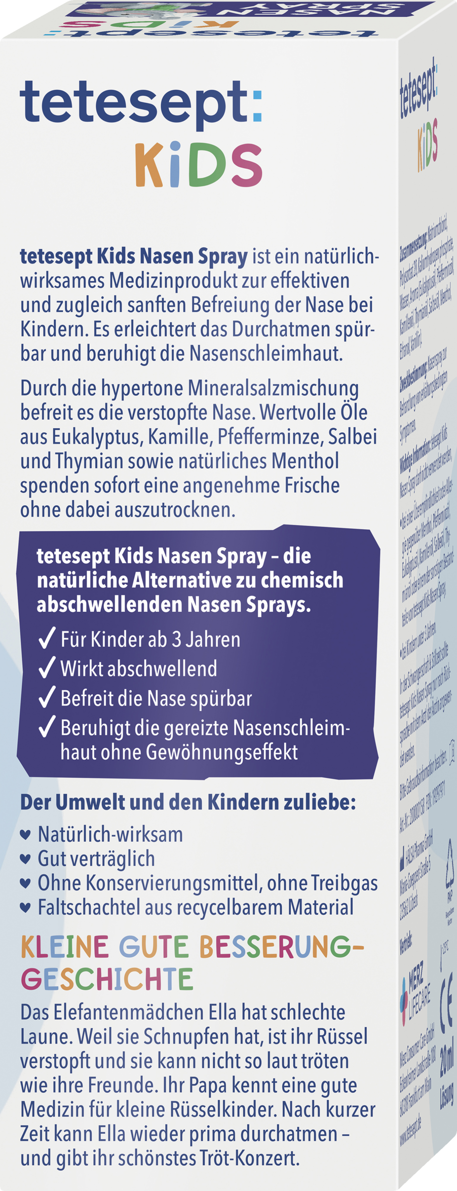 tetesept Kids Nasen Spray ist ein natürlich-wirksames Medizinprodukt zur effektiven und zugleich sanften Befreiung der Nase bei Kindern. Es erleichtert das Durchatmen spürbar und beruhigt die Nasenschleimhaut. Durch die hypertone Mineralsalzmischung befreit es die verstopfte Nase. Wertvolle Öle aus Eukalyptus, Kamille, Pfefferminze, Salbei und Thymian sowie natürliches Menthol spenden sofort eine angenehme Frische ohne dabei auszutrocknen.