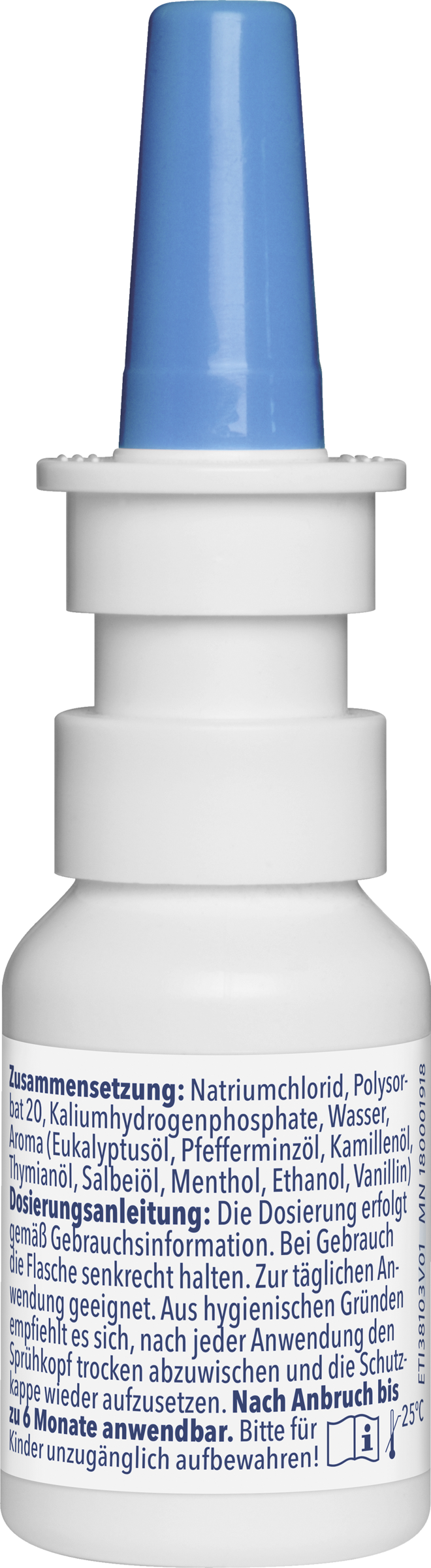 Ingredients: Natriumchlorid, Polysorbat 20, Kaliumhydrogen phos - phate, Wasser, Aroma (Eukalyptusöl, Pfefferminzöl, Kamillenöl, Thymianöl, Salbeiöl, Menthol, Ethanol, Vanillin)