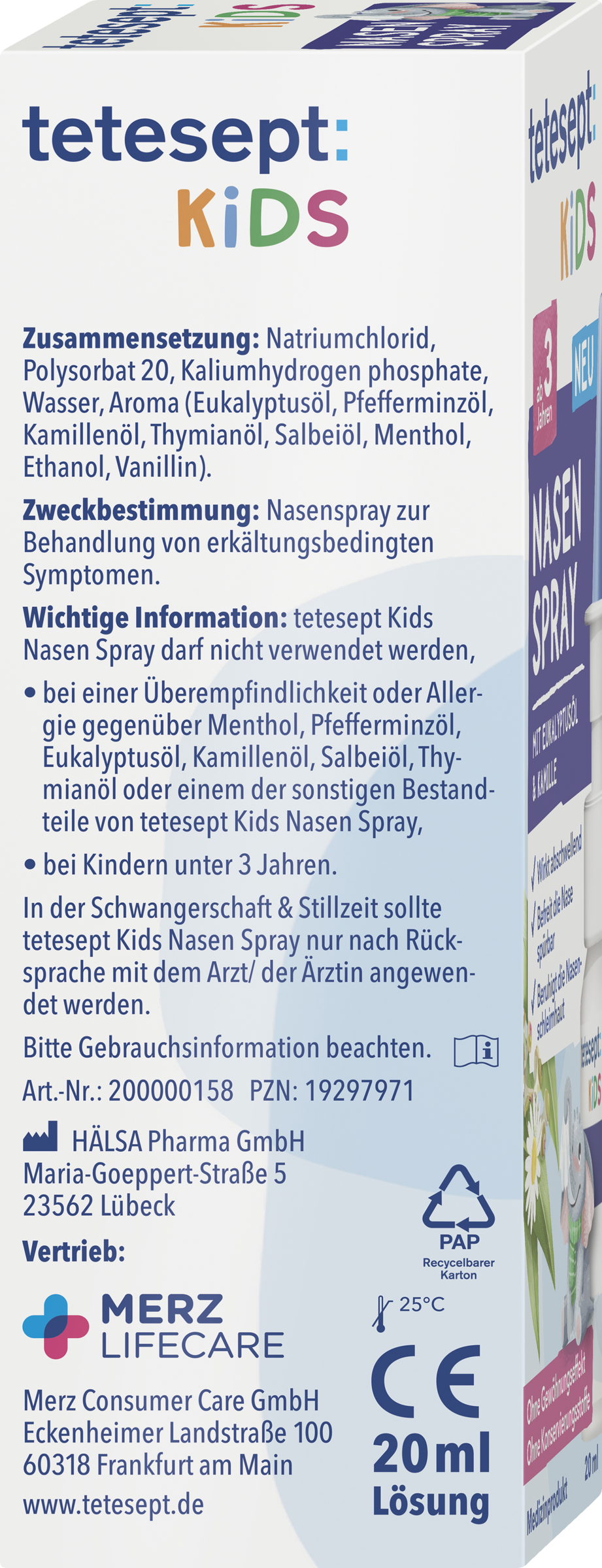 - bei einer Überempfindlichkeit oder Allergie gegenüber Menthol, Pfefferminzöl, Eukalyptusöl, Kamillenöl, Salbeiöl, Thymianöl oder einem der sonstigen Bestandteile von tetesept Kids Nasen Spray,