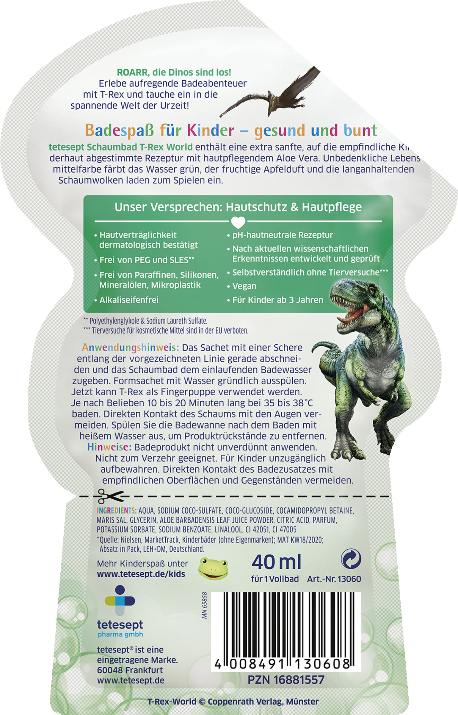 ROARR, die Dinos sind los! Erlebe aufregende Badeabenteuer mit T-Rex und tauche ein in die spannende Welt der Urzeit! Badespaß für Kinder - gesund und bunt tetesept Schaumbad T-Rex World enthält eine extra sanfte, auf die empfindliche Kinderhaut abgestimmte Rezeptur mit hautpflegendem Aloe Vera. Unbedenkliche Lebensmittelfarbe färbt das Wasser grün, der fruchtige Apfelduft und die langanhaltenden Schaumwolken laden zum Spielen ein.