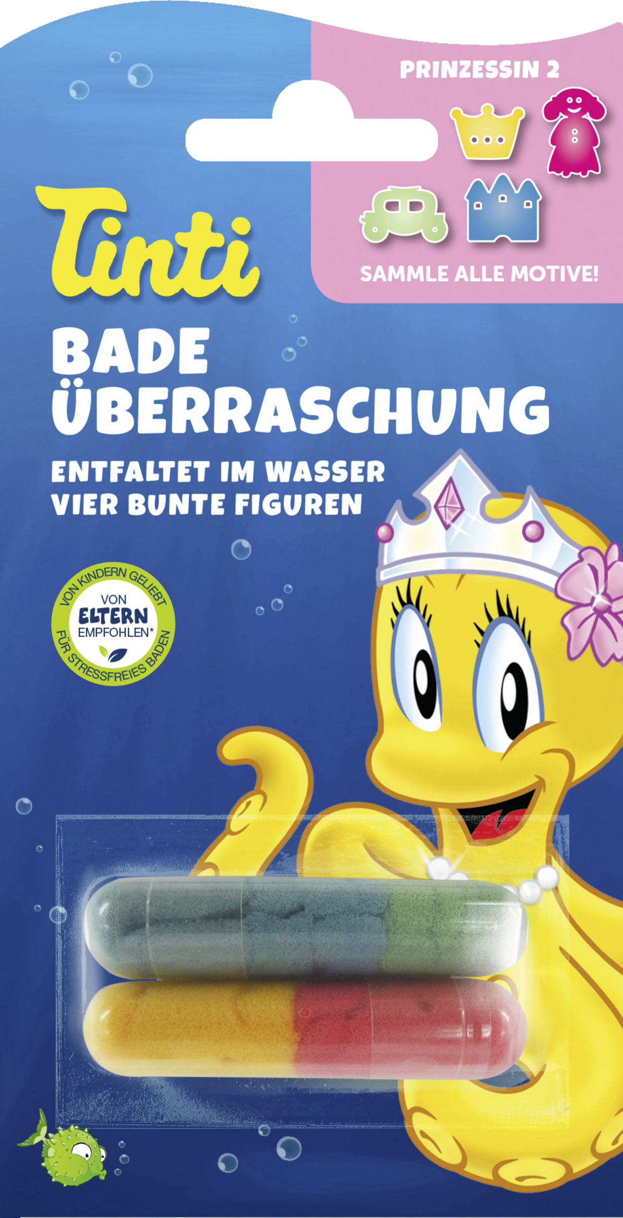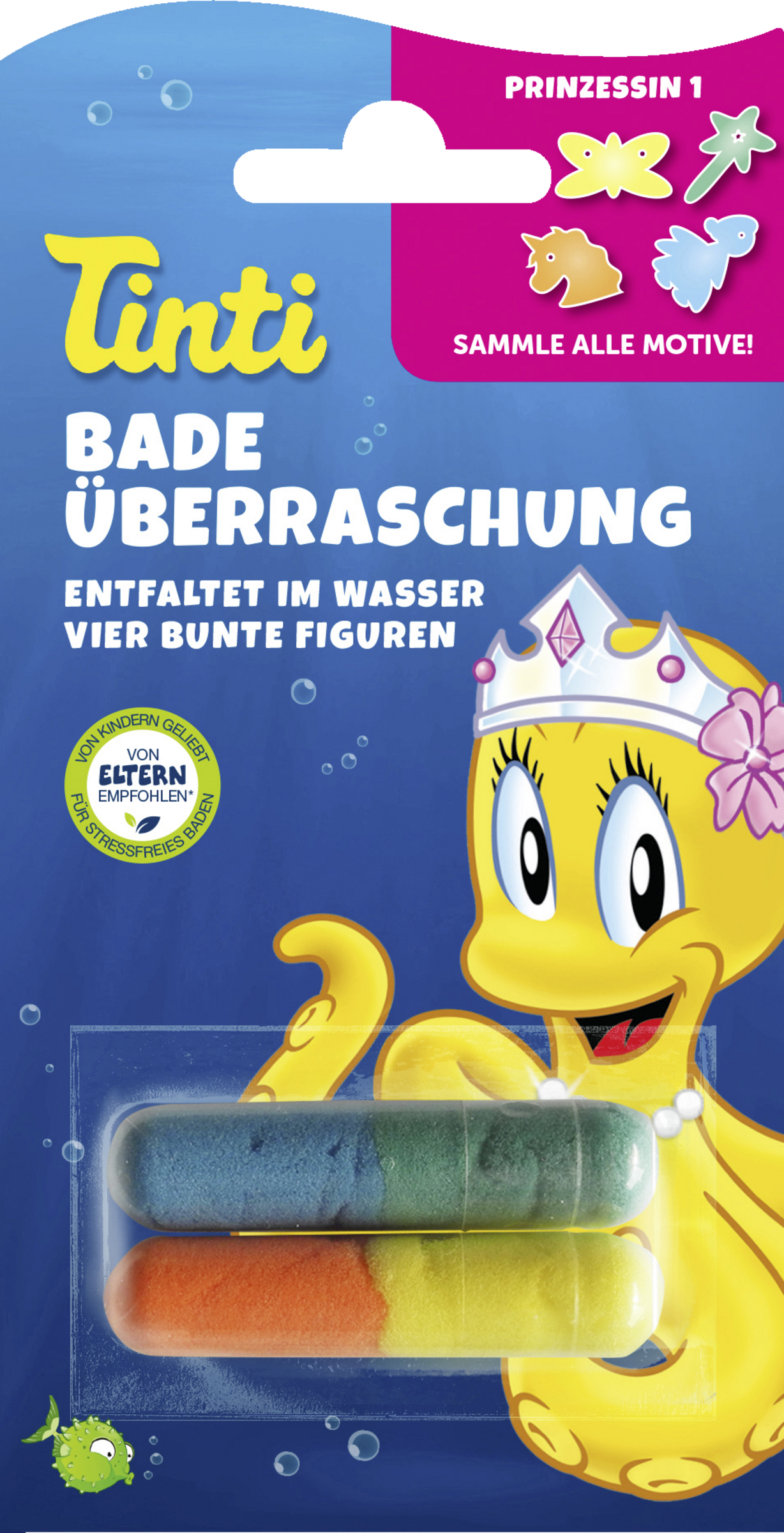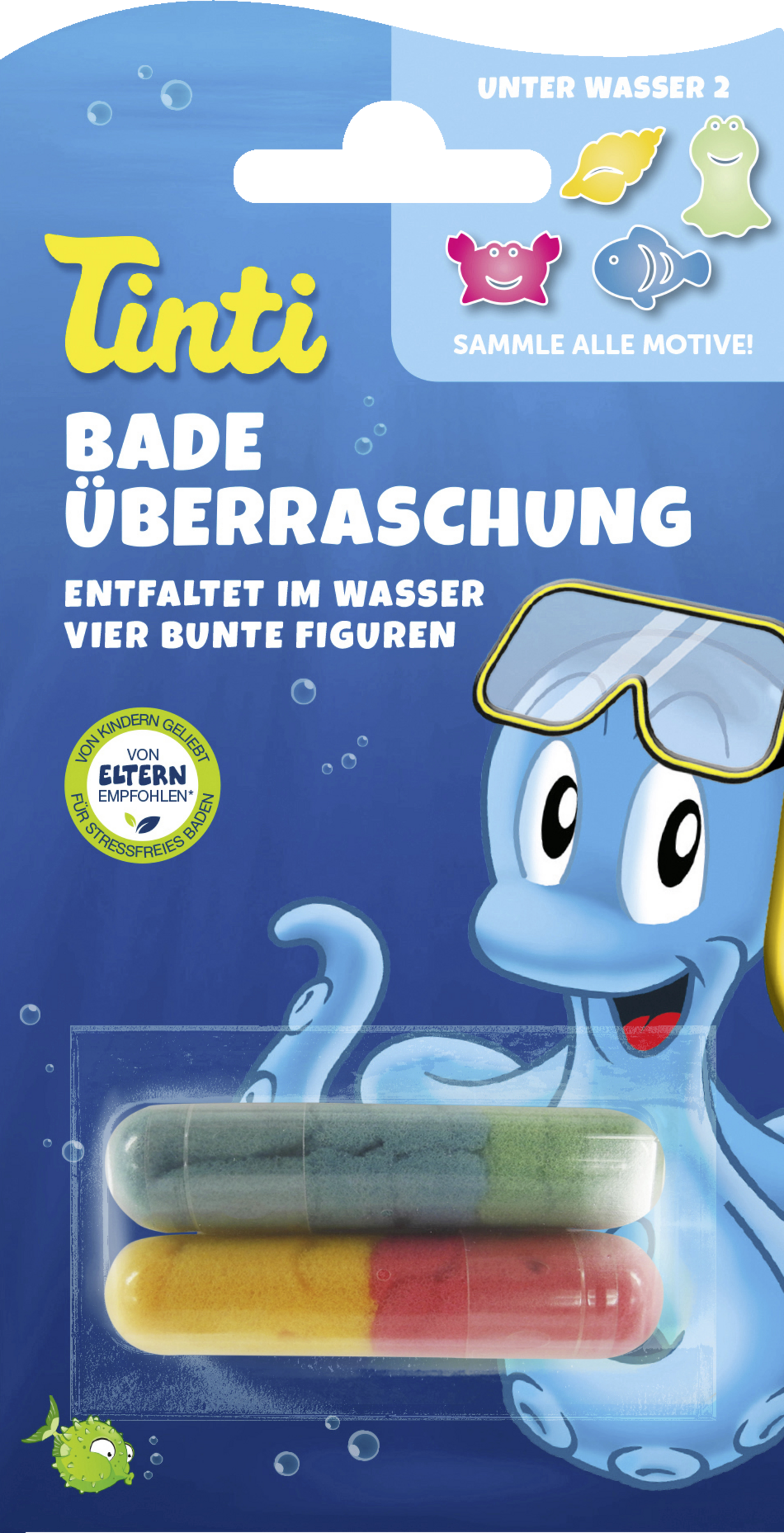 Ab in die Wanne – mit der Badeüberraschung erwarten dich viele Abenteuer! Die Tintis nehmen dich mit auf ihre Abenteuer in die Unterwasserwelt, ins Land der Dinos und Feen, auf Safari, zur Schatzsuche und vieles mehr. Erlebe die verschiedenen Themenwelten und sammle alle lustigen Schwammfiguren!