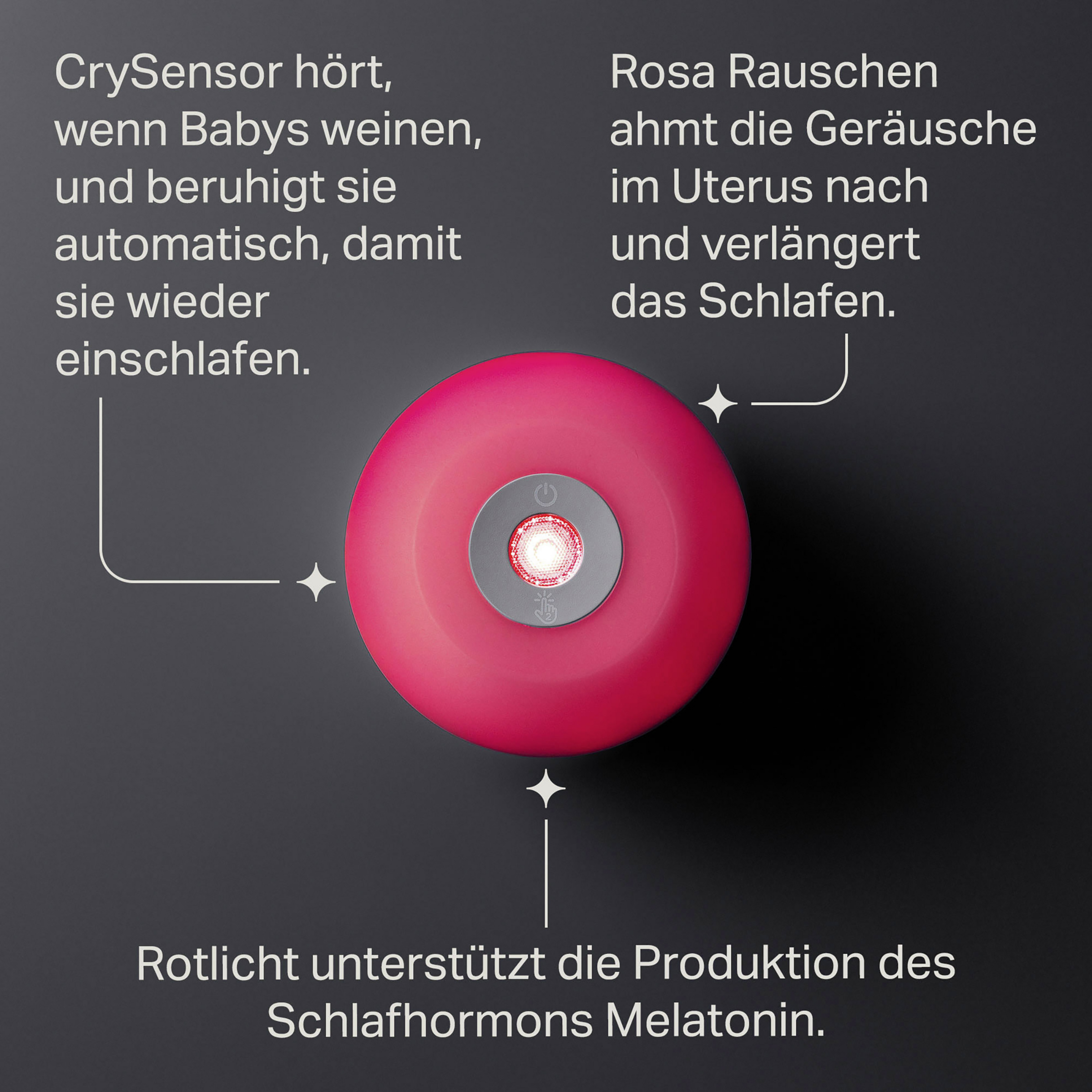 - CrySensor hört die Schreie der Säuglinge und beruhigt sie für ein leichtes wieder Einschlafen
