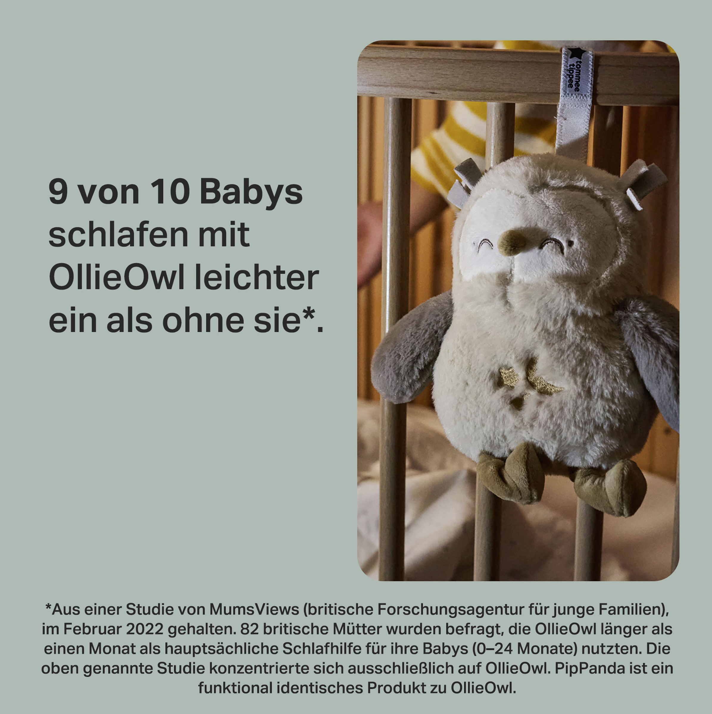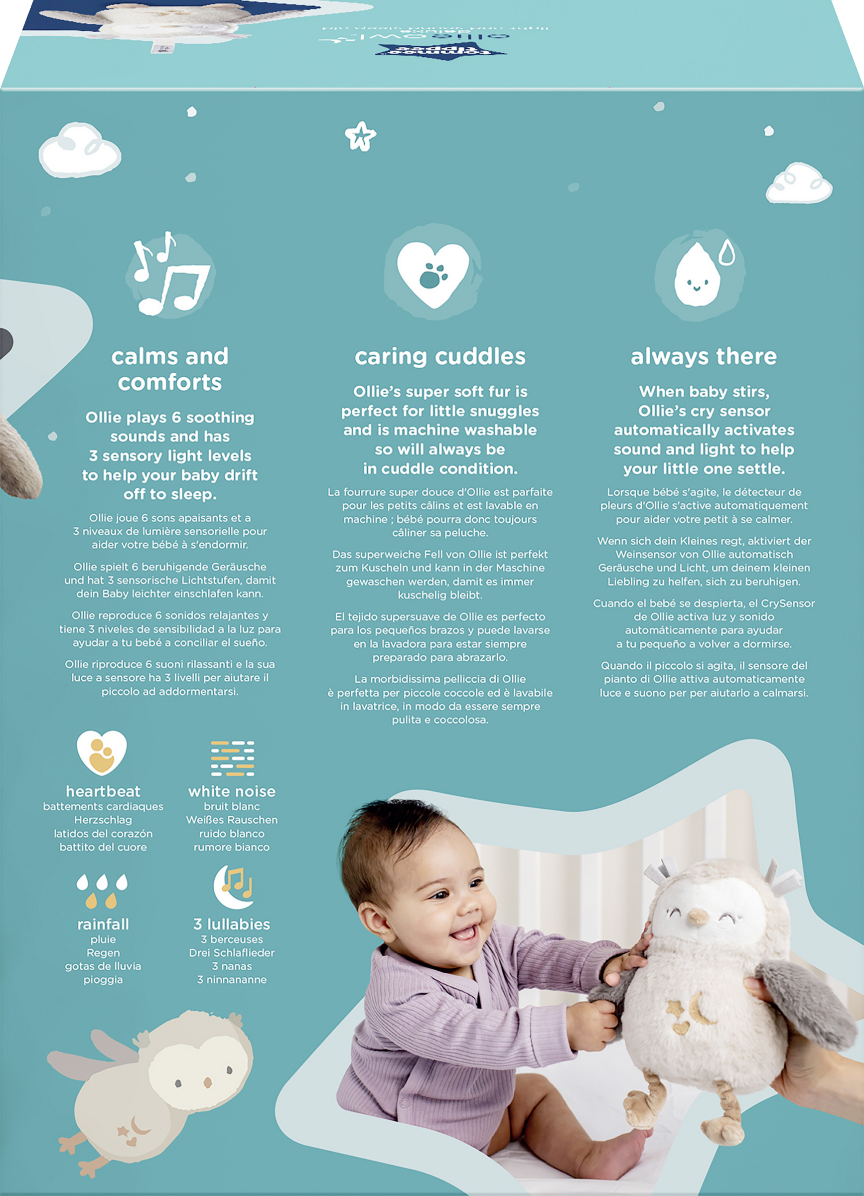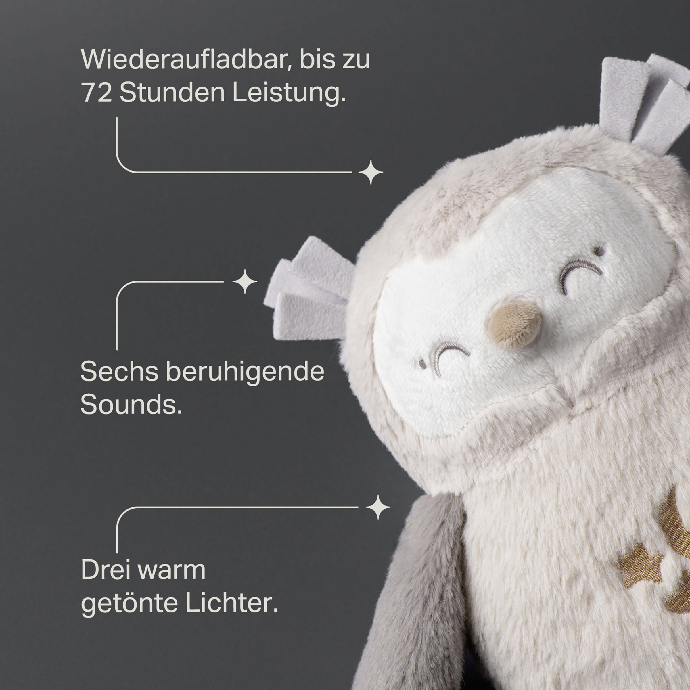 Ollie ist ein beruhigender Schlafbegleiter für die Nacht, der von Geburt an für dich da ist und deinem Baby beim Einschlafen mit dem CrySensor, einem beruhigenden Licht und entspannenden Geräuschen, hilft. Entwickelt für einen rundum besseren Schlaf.