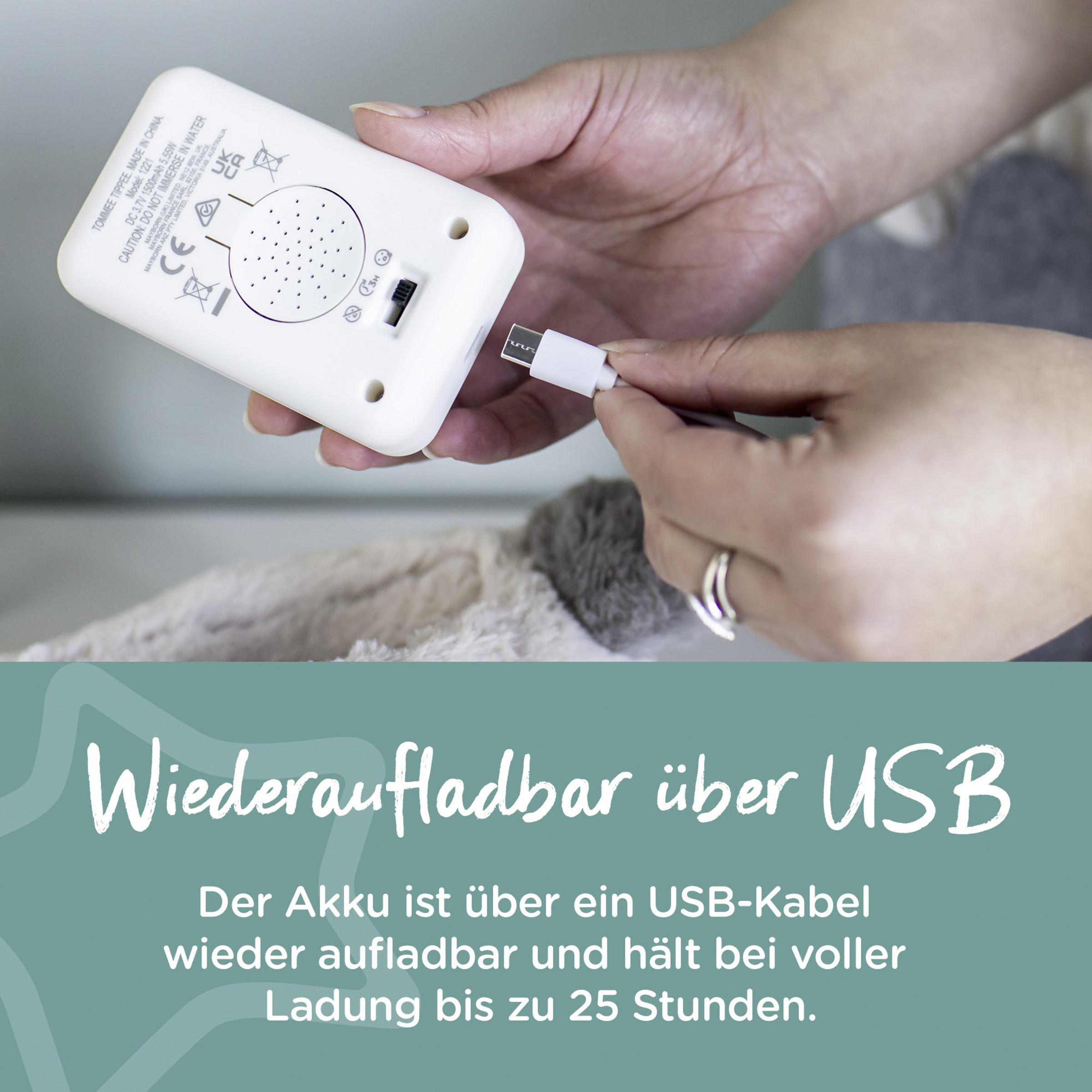 - über USB wiederaufladbar, eine Ladung hält bis zu 72 Stunden