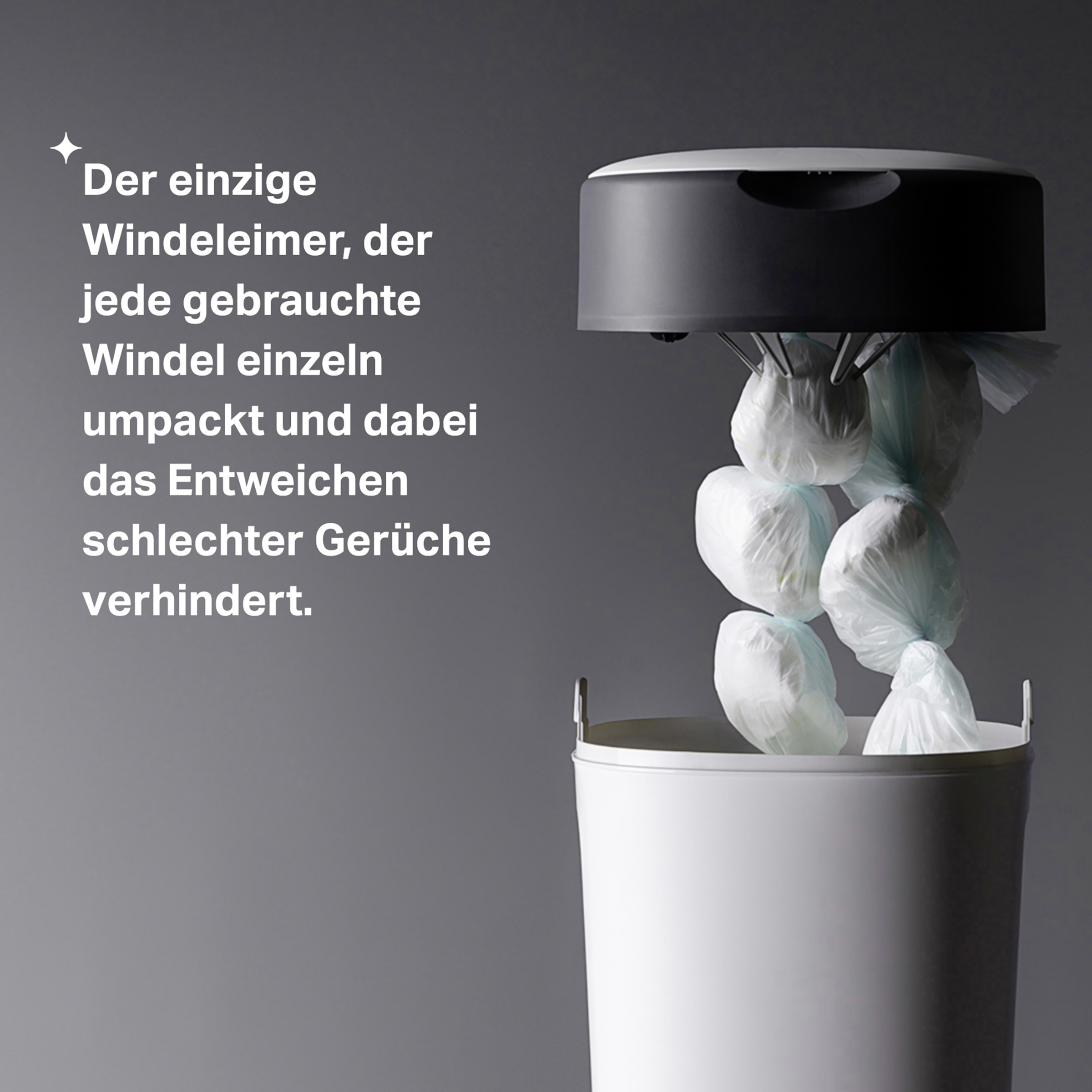 Der einzige Windeleimer, der jede gebrauchte Windel einzeln umpackt und dabei das Entweichen schlechter Gerüche verhindert. Garantierter Schutz vor Keimen*, weniger Schmutz und weniger Gänge zur Mülltonne.