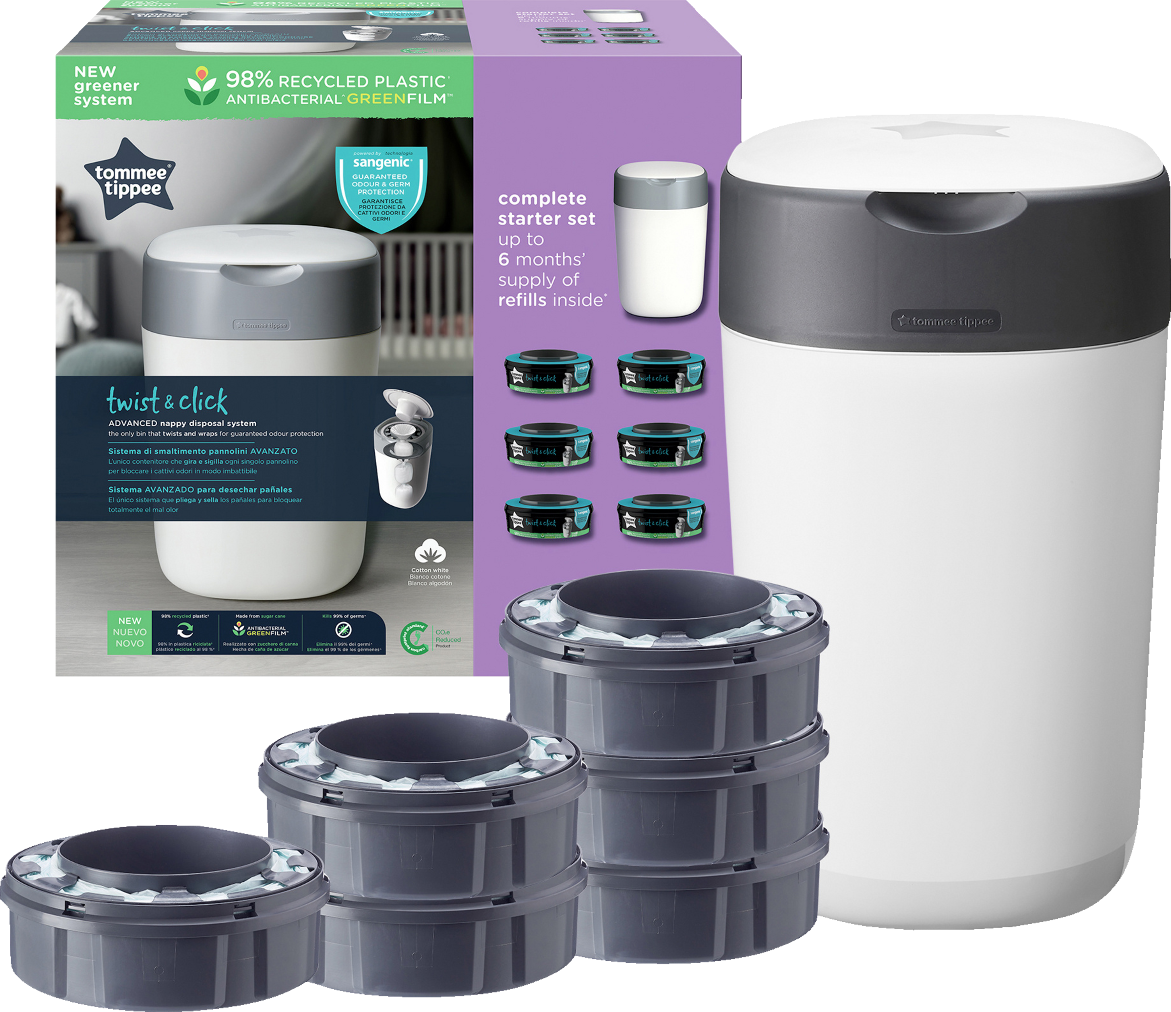 Das Twist & Click Windelentsorgungssystem ist nur mit den Twist & Click Nachfüllkassetten von Tommee Tippee kompatibel. Sangenic Ted & Simplee Sangenic Nachfüllkassetten sind für diesen Windeleimer nicht geeignet.