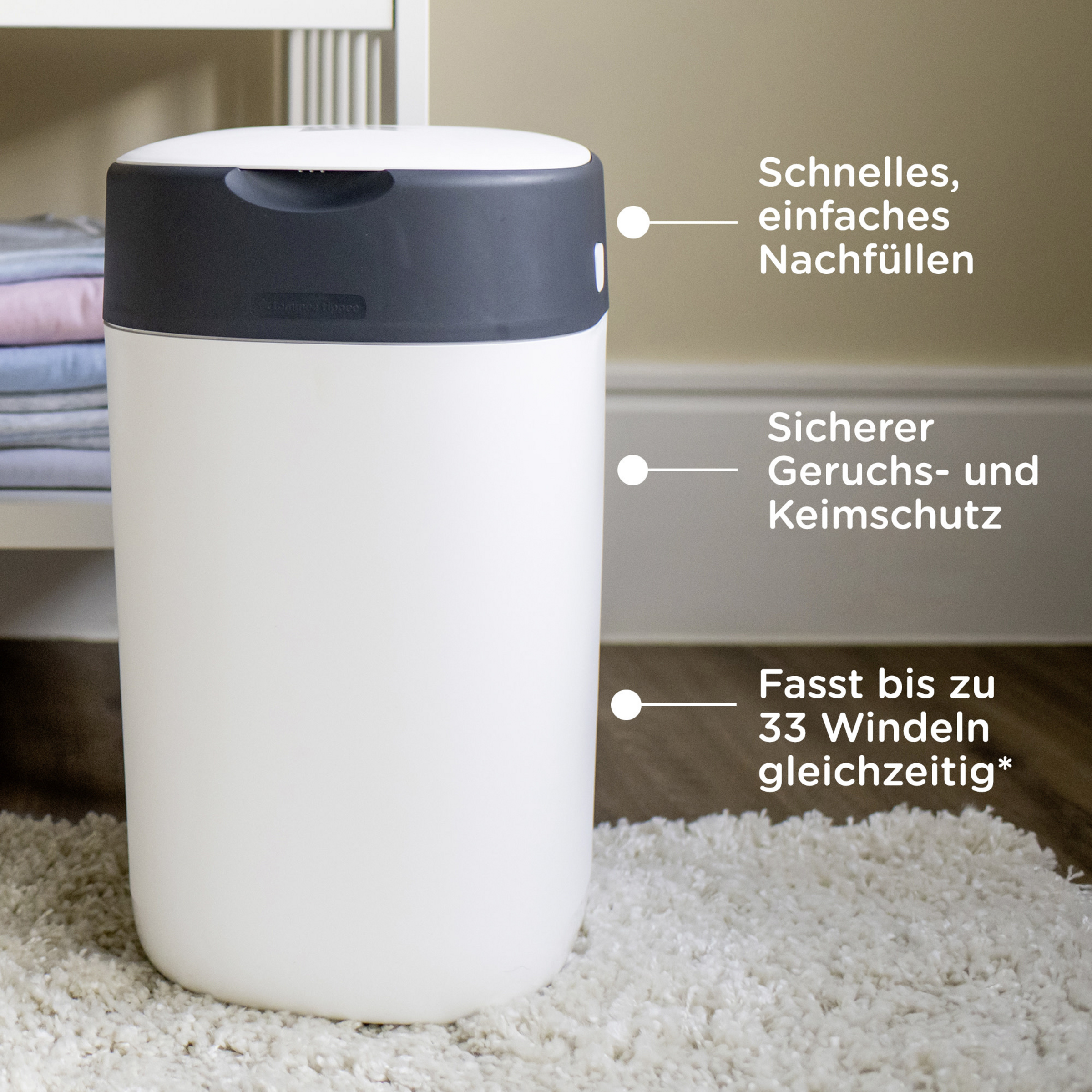 - fasst bis zu 33 Windeln (das sind 25 % mehr als bei Mitbewerbern**)