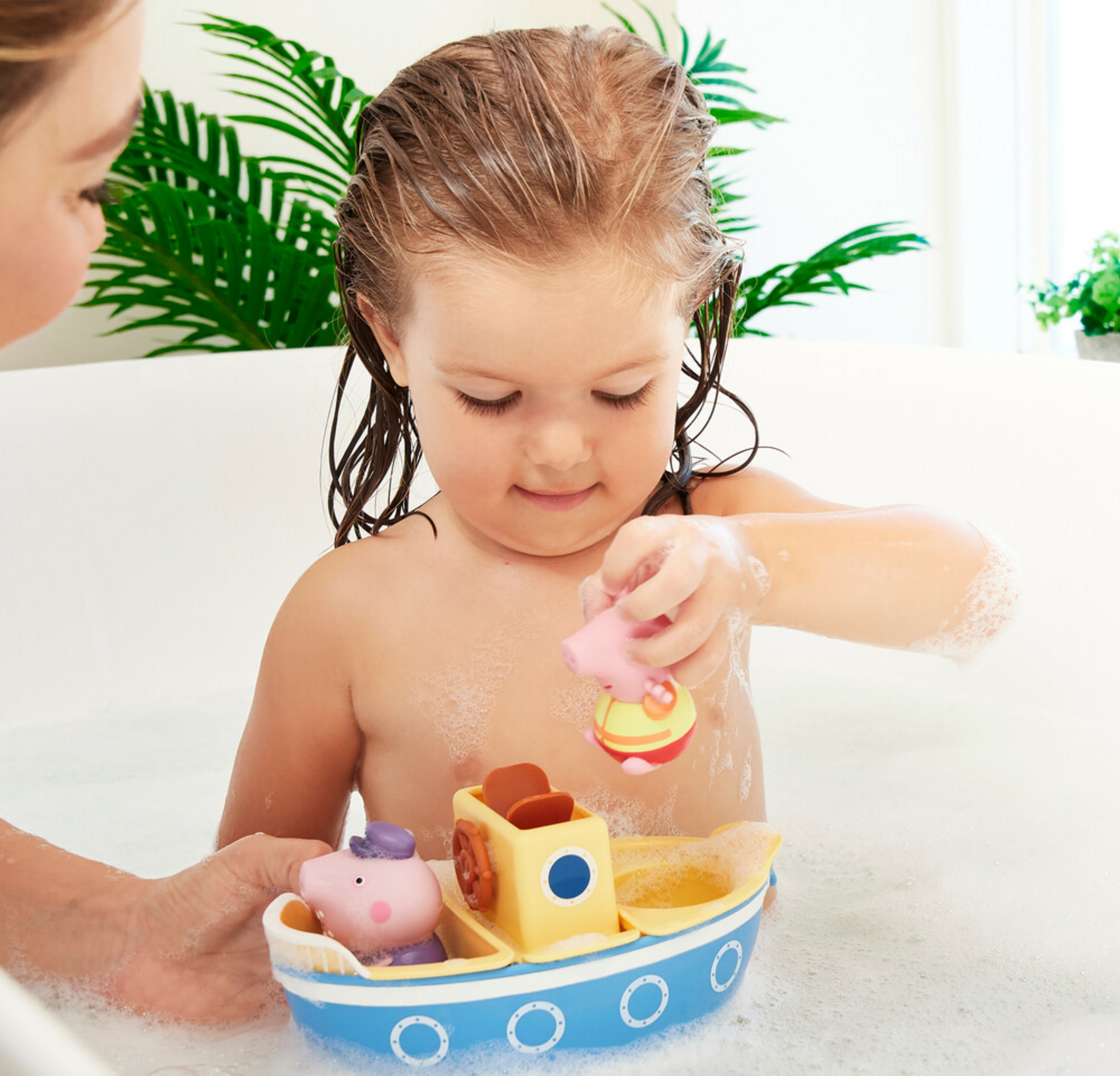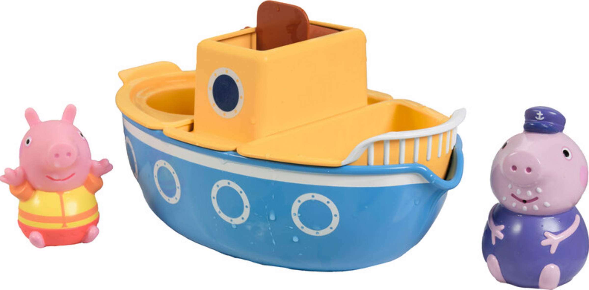 Bei einem Ausflug mit Opa Wutz aufs Wasser ist gute Laune garantiert. Denn mit seinem Boot zu segeln ist eine seiner Lieblingsbeschäftigungen, und er hat vier Möglichkeiten, Wellen zu schlagen! Im Inneren des ozeanblauen Rumpfes befinden sich drei verspielte Teile. An einem Ende lässt sich ein Teil herausklappen, das die Kleinen mit Wasser füllen und als Wasserspender verwenden können. Am anderen Ende befindet sich ein weiteres Teil, das ein anderes Muster versprüht. Einfach auffüllen und los geht's!