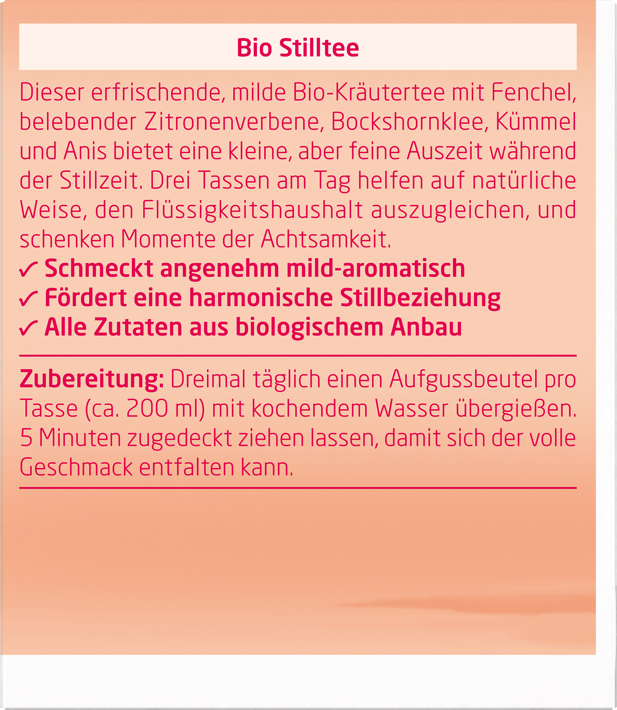 Wärme, Nähe und Geborgenheit machen aus Stillen mehr als nur eine Nahrungsaufnahme für Ihr Baby. Drei Tassen Weleda Stilltee pro Tag helfen, Ihren Flüssigkeitshaushalt auszugleichen und unterstützen so die Milchbildung und eine entspannte Stillzeit. Die ausgewählten Früchte von Bockshornklee, Anis, Kümmel, Fenchel und Zitronenverbenenblätter verleihen diesem Kräutertee seinen angenehm milden Geschmack. Alle Zutaten stammen aus kontrolliert biologischem Anbau.