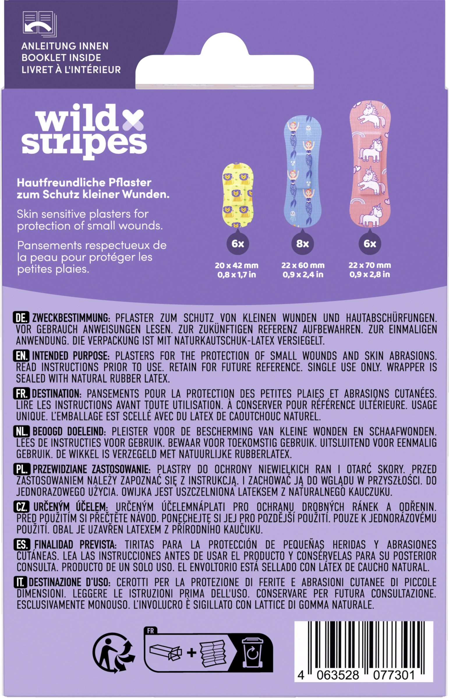 Wild Stripes Kids Sensitive Fantasy ist ein EU-konformes Medizinprodukt, das mehr bietet als nur Schutz. Hypoallergen und hautfreundlich, bietet das Pflaster super starken Halt und effektiven Schutz vor Schmutz und Bakterien. Die Kids Sensitive Pflaster sind wasserresistent, ermöglichen bis zu 24 Stunden Tragedauer und das Entfernen ist komplett schmerzlos. Das einzigartige Design und die patentierten Formen bieten einen stylischen Schutz für kleine Wunden.