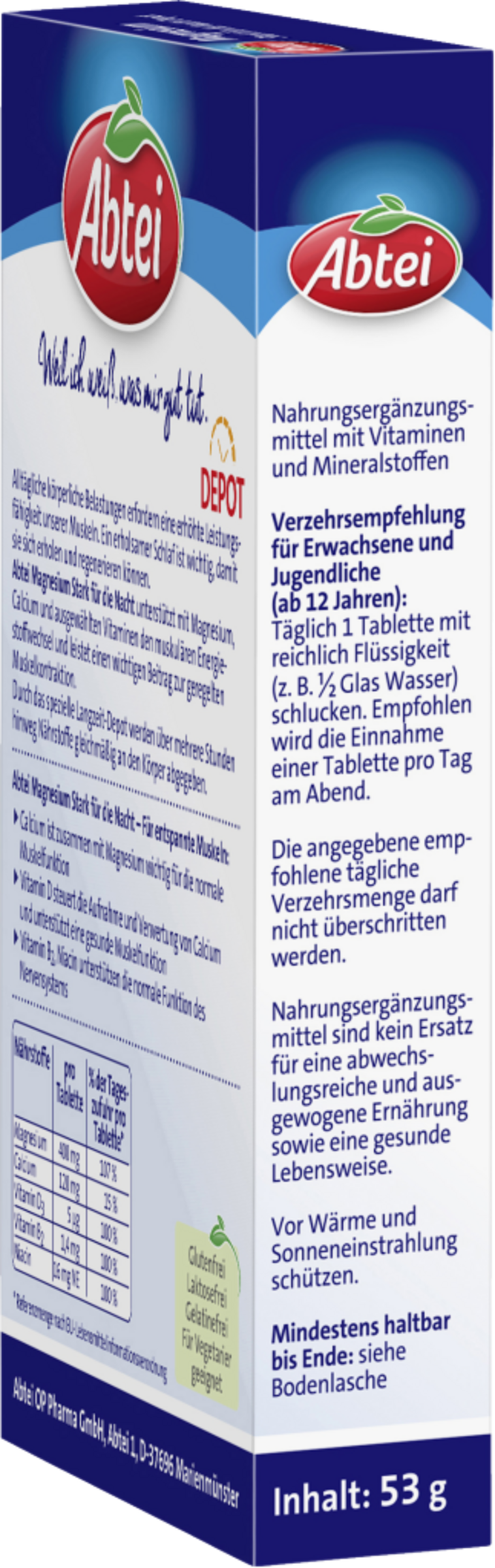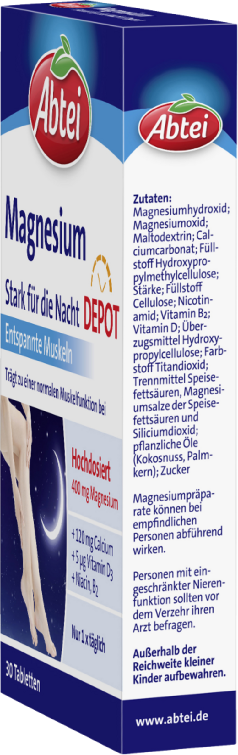 Alltägliche körperliche Belastungen erfordern eine erhöhte Leistungsfähigkeit unserer Muskeln. Ein erholsamer Schlaf ist wichtig, damit sie sich erholen und regenerieren können. Abtei Magnesium Stark für die Nacht unterstützt mit Magnesium, Calcium und ausgewählten Vitaminen den muskulären Energiestoffwechsel und leistet einen wichtigen Beitrag zur geregelten Muskelkontraktion. Durch das spezielle Langzeit-Depot werden über mehrere Stunden hinweg Nährstoffe gleichmäßig an den Körper abgegeben.