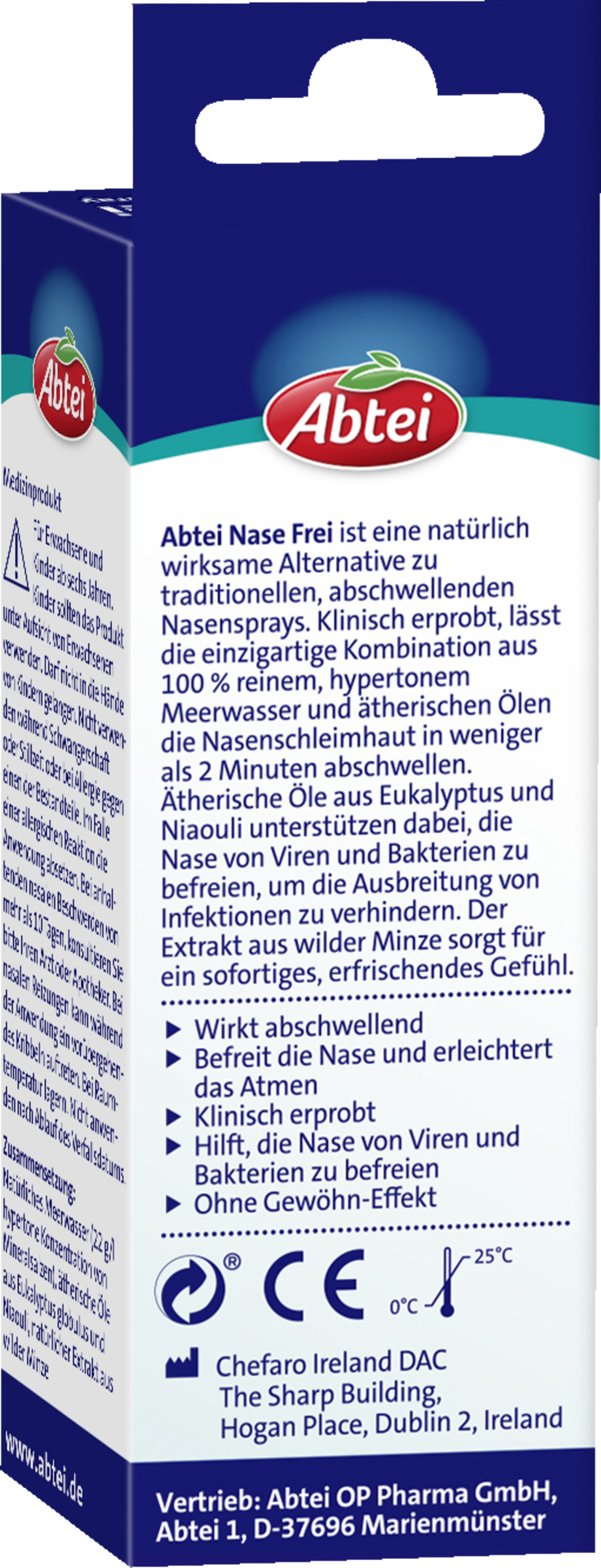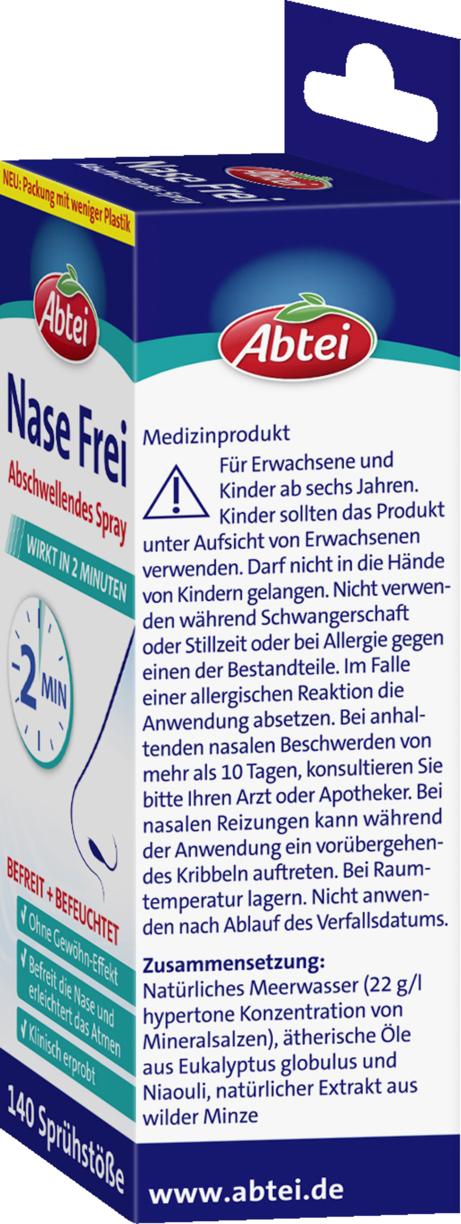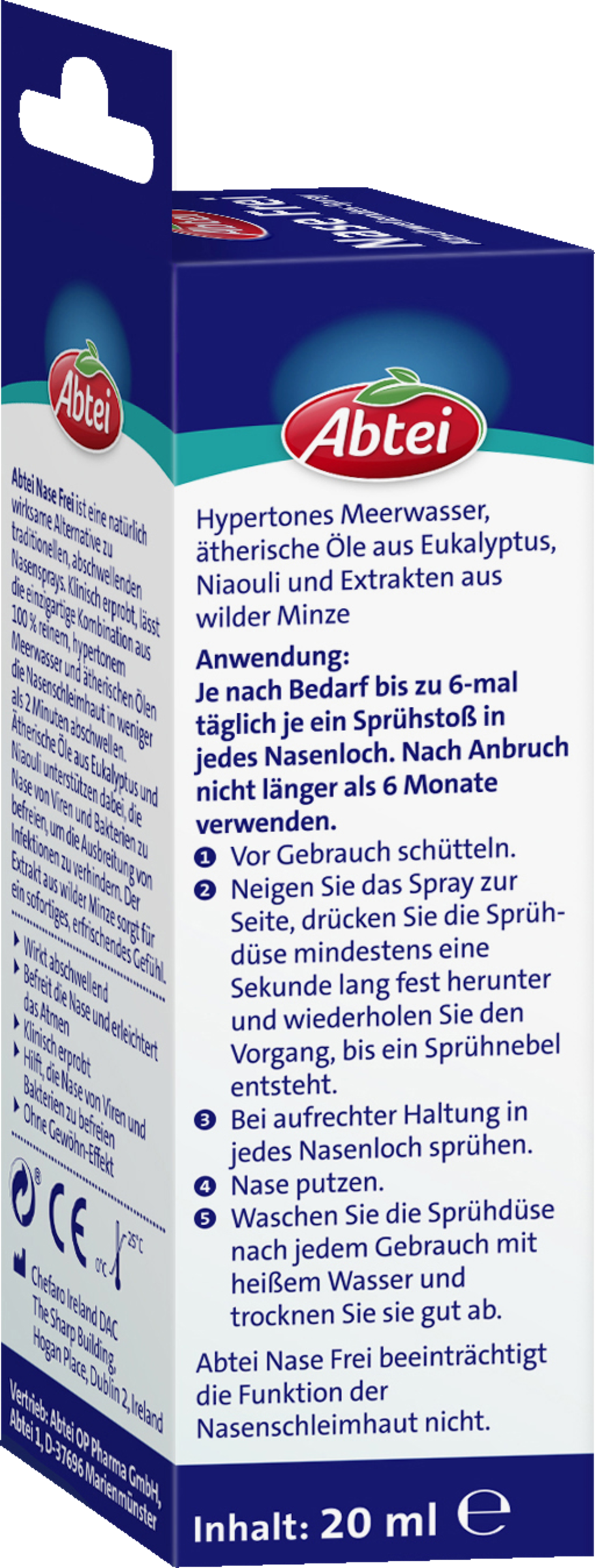 Abtei Nase Frei ist eine natürlich wirksame Alternative zu traditionellen, abschwellenden Nasensprays. Klinisch erprobt, lässt die einzigartige Kombination aus 100% reinem, hypertonem Meerwasser und ätherischen Ölen die Nasenschleimhaut in weniger als 2 Minuten abschwellen. Ätherische Öle aus Eukalyptus und Niaouli unterstützen dabei, die Nase von Viren und Bakterien zu befreien, um die Ausbreitung von Infektionen zu verhindern. Der Extrakt aus wilder Minze sorgt für ein sofortiges, erfrischendes Gefühl.