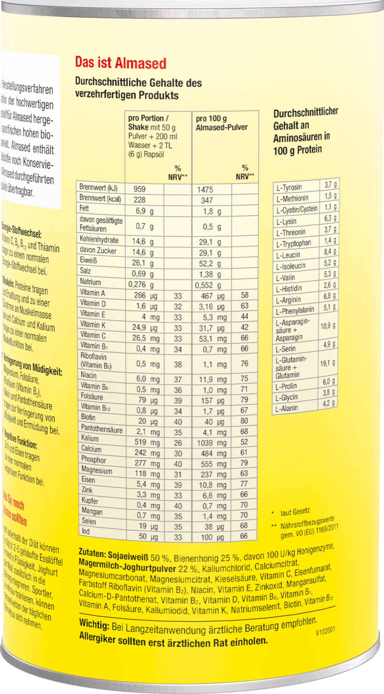 SOJAEIWEIß 50%, Bienenhonig 25%, davon 100 U/kh Honigenzyme, MAGERMILCH-JOGHURTPULVER 22%, Kaliumchlorid, Calciumcitrat, Magnesiumcarbonat, Magnesiumcitrat, Kieselsäure, Vitamin C, Eisenfumarat, Farbstoff Riboflavin (Vitamin B2), Niacin, Vitamin E, Zinkoxid, Mangansulfat, Calcium-D-Pantothenat, Vitamin B2, Vitamin D, Vitamin B6, Vitamin B1, Vitamin A, Folsäure, Kaliumiodid, Vitamin K, Natriumselenit, Biotin, Vitamin B12.