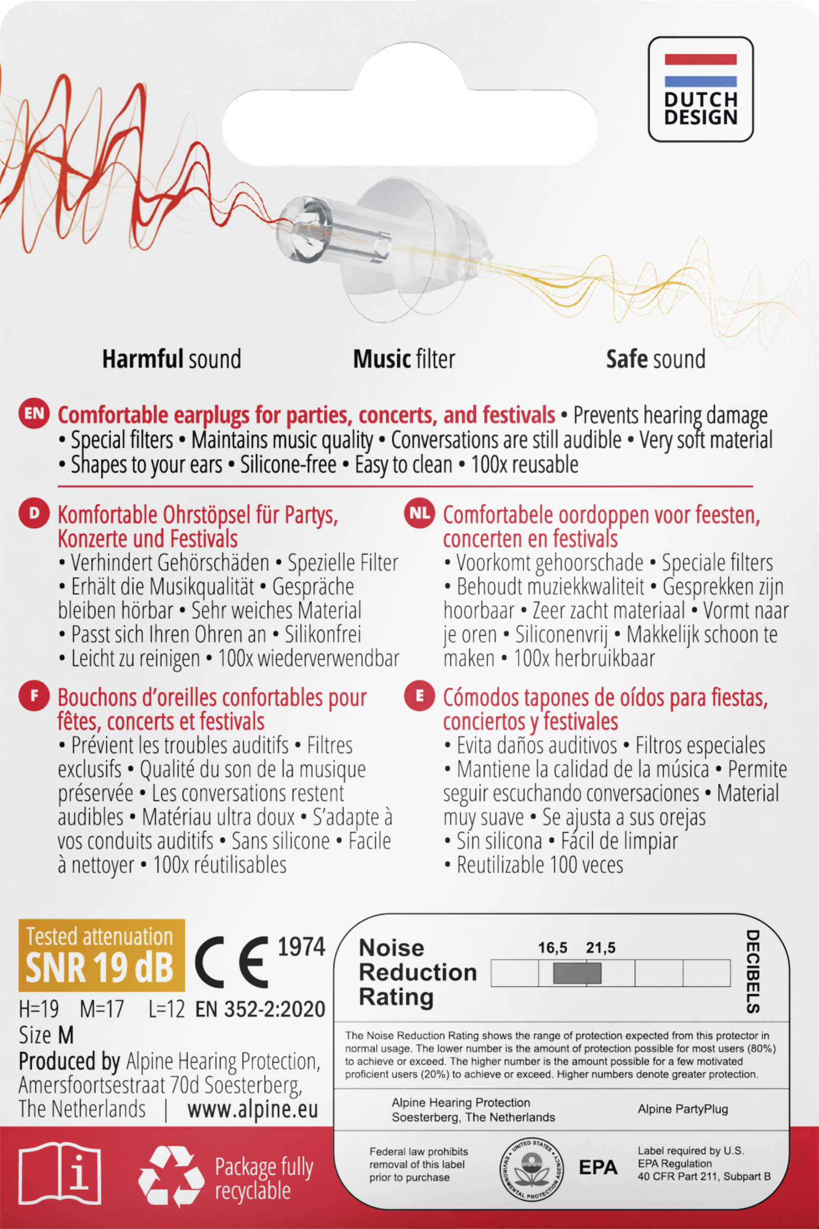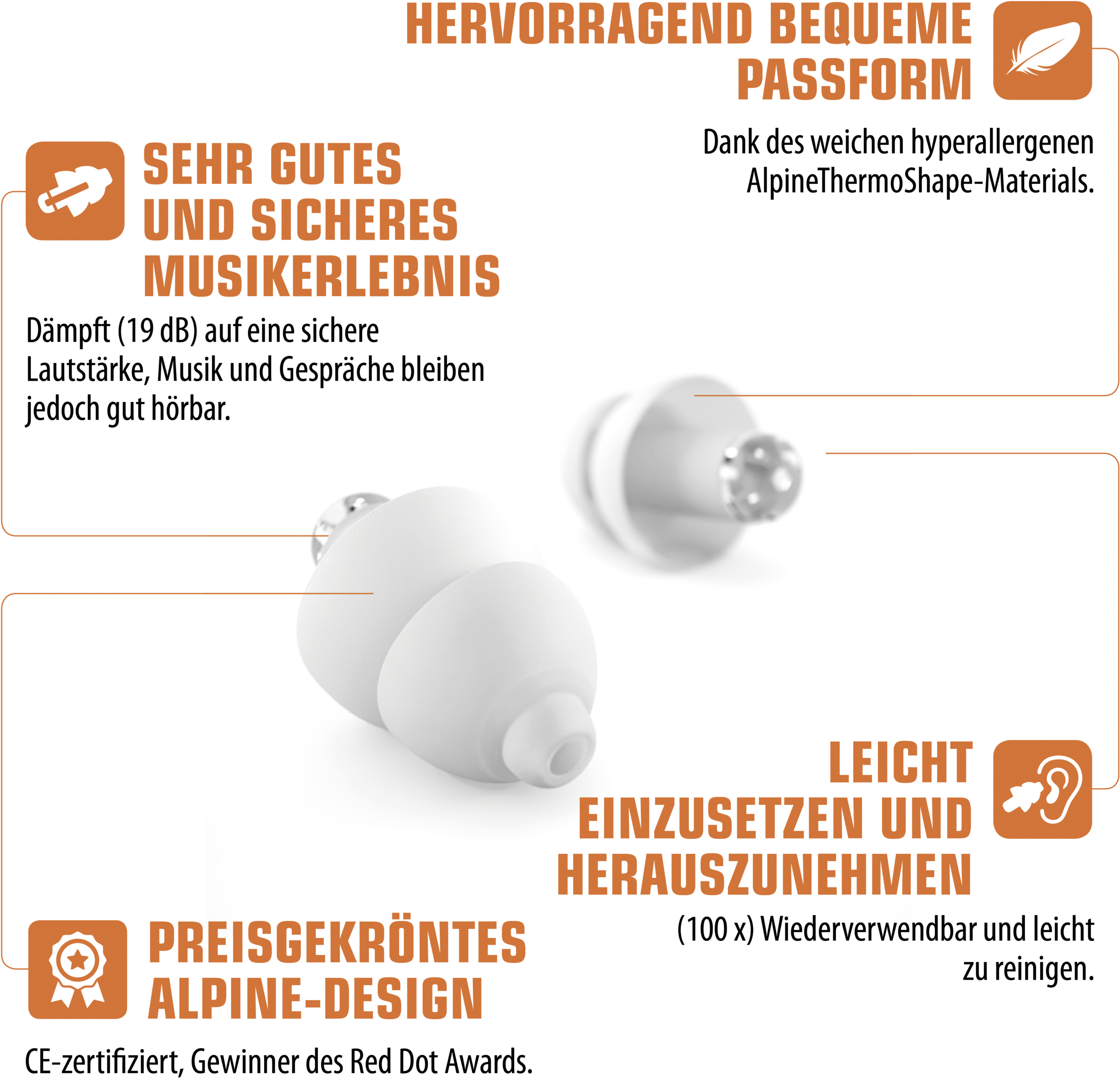 Wenn Sie ein Konzert oder Festival besuchen, möchten Sie die Musik genießen, ohne Ihr Gehör zu schädigen. Die Alpine PartyPlug-Ohrstöpsel wurden speziell entwickelt, um die Lautstärke der Musik auf ein sicheres Niveau zu reduzieren. Gleichzeitig bleibt die Klangqualität sehr hoch und die Unterhaltung mit Freunden möglich. Die PartyPlug-Ohrstöpsel können den ganzen Tag (oder die ganze Nacht) getragen werden. Durch das weiche und flexible thermoplastische Material passt sich der Ohrstöpsel an Ihren Gehörgang an. Dieses Material ist darüber hinaus hypoallergen und silikonfrei. Es verursacht daher keine allergischen Reaktionen oder Juckreiz. Die PartyPlug-Ohrstöpsel sind bis zu 100 Mal wiederverwendbar. So können Sie sie problemlos die gesamte Festivalsaison über verwenden. Schonen Sie Ihre Ohren und sorgen Sie dafür, dass Sie Ihre Lieblingsband oder Ihren Lieblings-DJ noch lange genießen können.