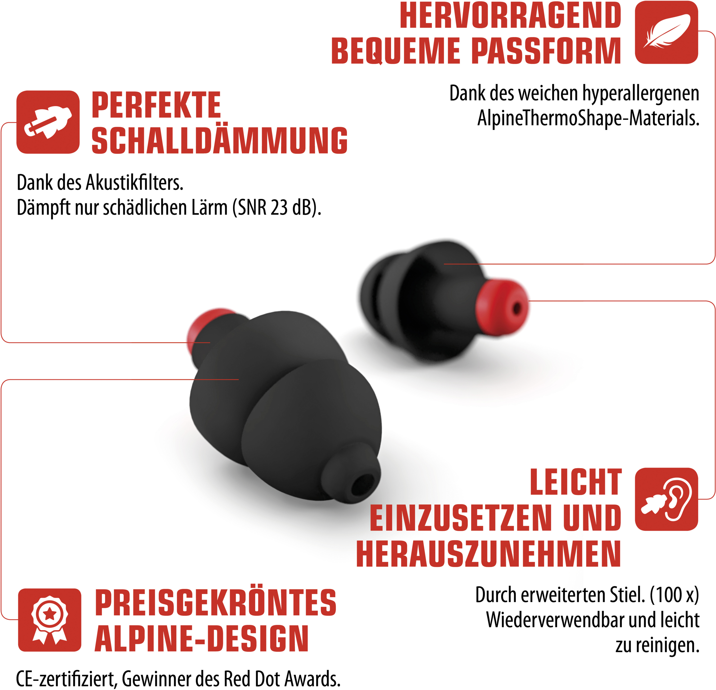 - schädliche Geräusche werden auf eine sichere Lautstärke reduziert (Dämmung von (SNR) 23 dB)