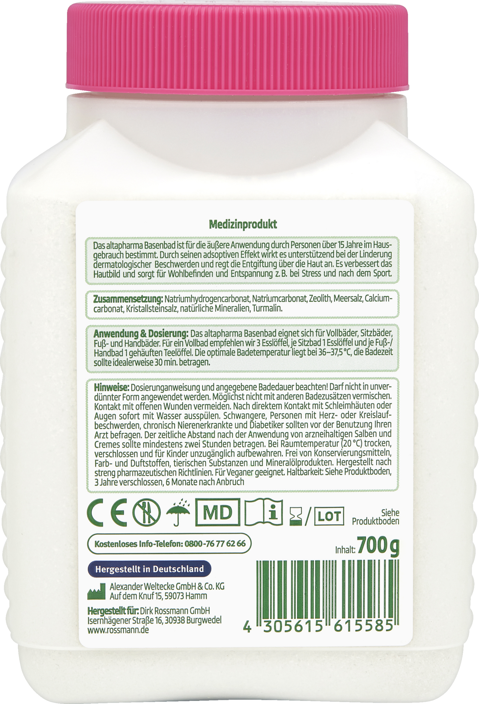 Das altapharma Basenbad nicht unverdünnt anwenden. Nach direktem Kontakt mit Schleimhäuten oder Augen sofort mit Wasser ausspülen. Personen mit Herz- oder Kreislaufbeschwerden sollten vor der Benutzung ihren Arzt befragen. Für Kinder unzugänglich aufbewahren.