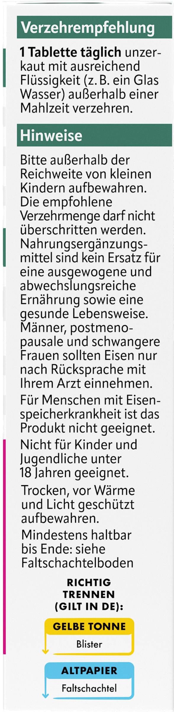 - 100% Tagesdosis: 14 mg Eisen pro Tablette