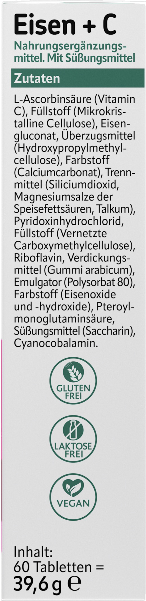 L-Ascorbinsäure (Vitamin C), Füllstoff (Mikrokristalline Cellulose), Eisengluconat, Überzugsmittel (Hydroxypropylmethylcellulose), Farbstoff (Calciumcarbonat), Trennmittel (Siliciumdioxid, Magnesiumsalze der Speisefettsäuren, Talkum), Pyridoxinhydrochlorid, Füllstoff (Vernetzte Carboxymethylcellulose), Riboflavin, Verdickungsmittel (Gummi arabicum) Emulgator (Polysorbat 80), Farbstoff (Eisenoxide und -hydroxide), Pteroylmonoglutaminsäure, Süßungsmittel (Saccharin), Cyanocobalamin.