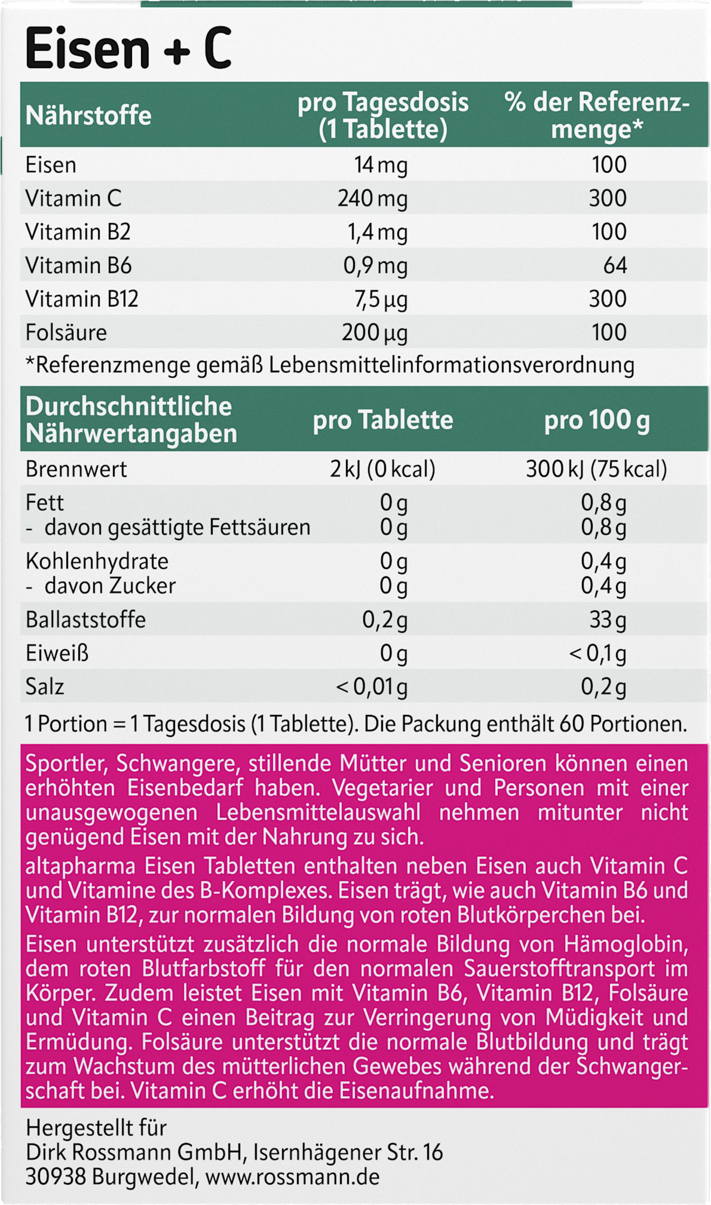Sportler, Schwangere, stillende Mütter und Senioren können einen erhöhten Eisenbedarf haben. Vegetarier und Personen mit einer unausgewogenen Lebensmittelauswahl nehmen mitunter nicht genügend Eisen mit der Nahrung zu sich. Altapharma Eisentabletten enthalten neben Eisen auch Vitamin C und Vitamine des B-Komplexes, die im Eisen- und Blutstoffwechsel von Bedeutung sind. Eisen ist an der normalen Bildung des roten Blutfarbstoffs beteiligt und bewirkt so den normalen Sauerstofftransport im Blut. So kann Eisen auch zur Verringerung von Müdigkeit und Ermüdung beitragen. Weiterhin hat es eine Funktion bei der Zellteilung. Vitamin C steigert die Eisenaufnahme. Die Vitamine B6, B12 und Folsäure tragen zur normalen Bildung roter Blutkörperchen bei. Vitamin B2 unterstützt zudem den normalen Eisen-Stoffwechsel und trägt zusammen mit Eisen, den Vitaminen B6, B12 und C zu einer Verringerung von Müdigkeit und Ermüdung bei und unterstützt so die Leistungsfähigkeit.