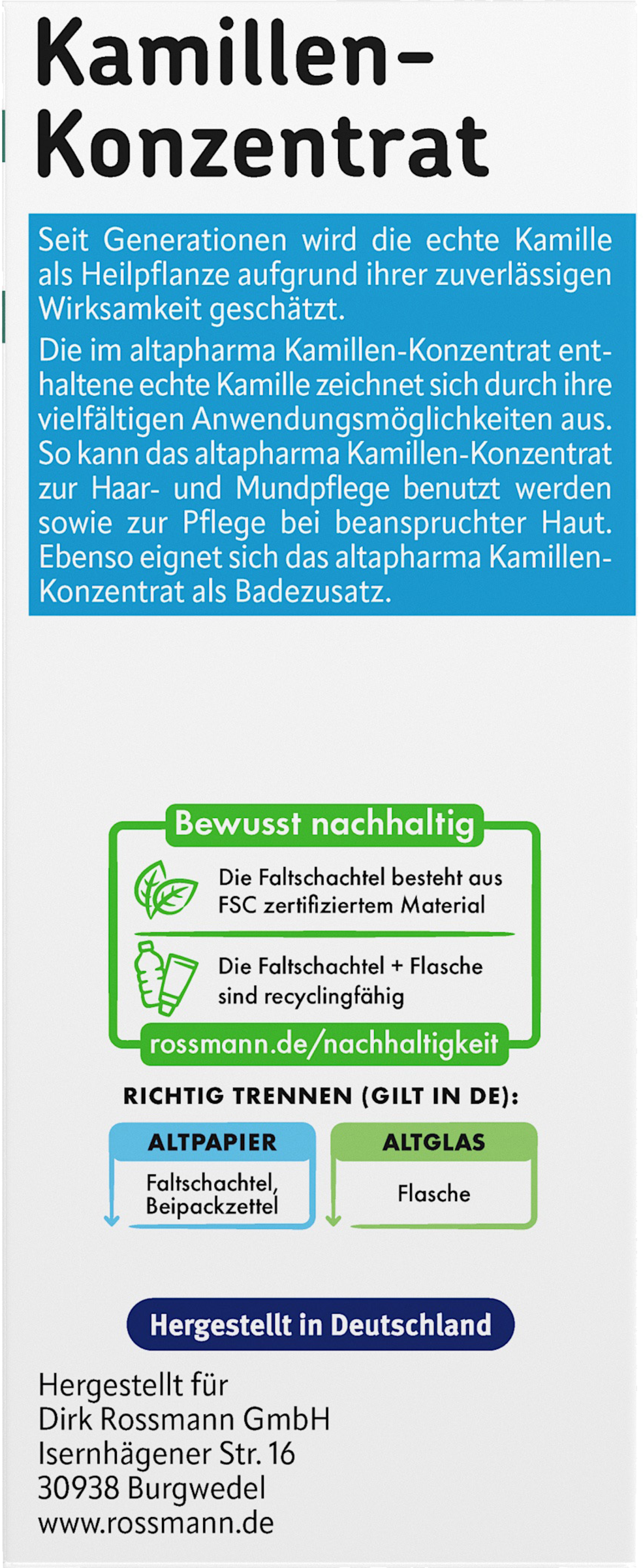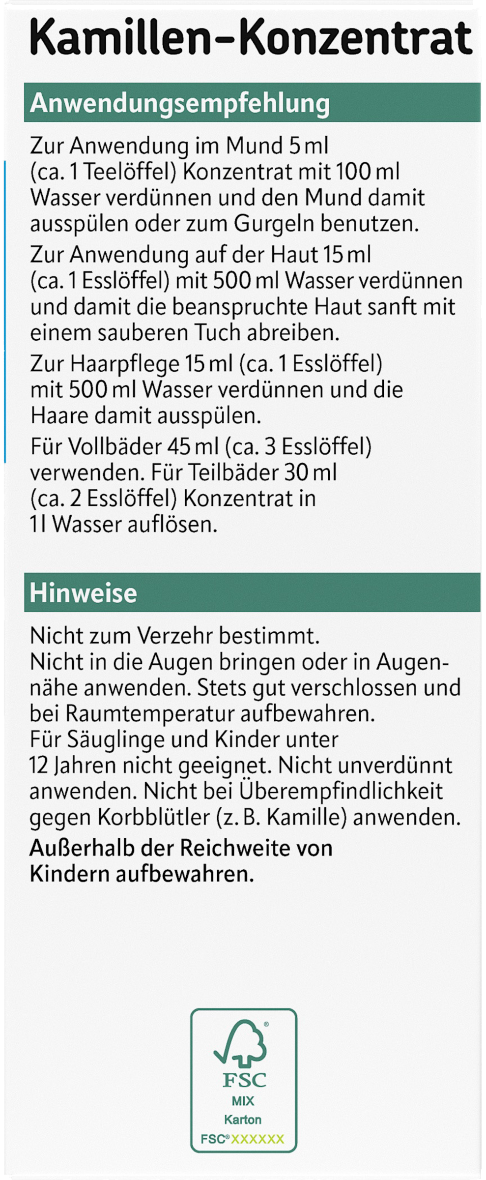 Nicht zum Verzehr bestimmt. Nicht in die Augen bringen oder in Augennähe anwenden. Stets gut verschlossen und bei Raumtemperatur aufbewahren. Für Säuglinge und Kinder unter 12 Jahren nicht geeignet. Nicht unverdünnt anwenden. Nicht bei Überempfindlichkeit gegen Korbblütler (z. B. Kamille) anwenden.