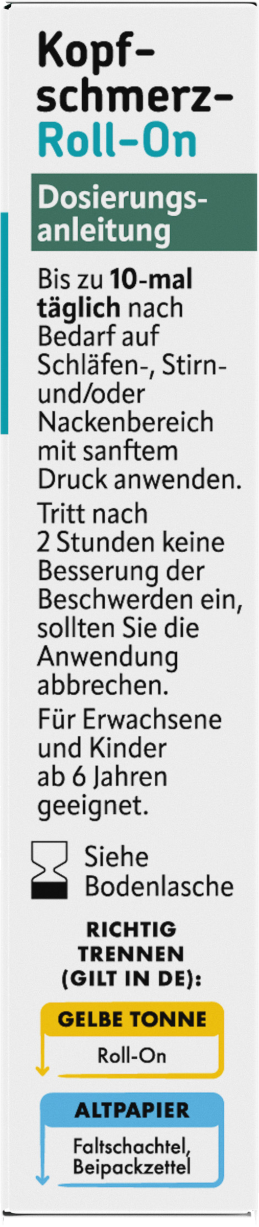 Bis zu 10 mal täglich nach Bedarf auf Schläfen-, Stirn und/ oder Nackenbereich mit sanftem Druck anwenden.Tritt nach 2 Stunden keine Besserung der Beschwerden ein, sollten Sie die Anwendung abbrechen. Für Erwachsene und Kinder ab 6 Jahren geeignet.