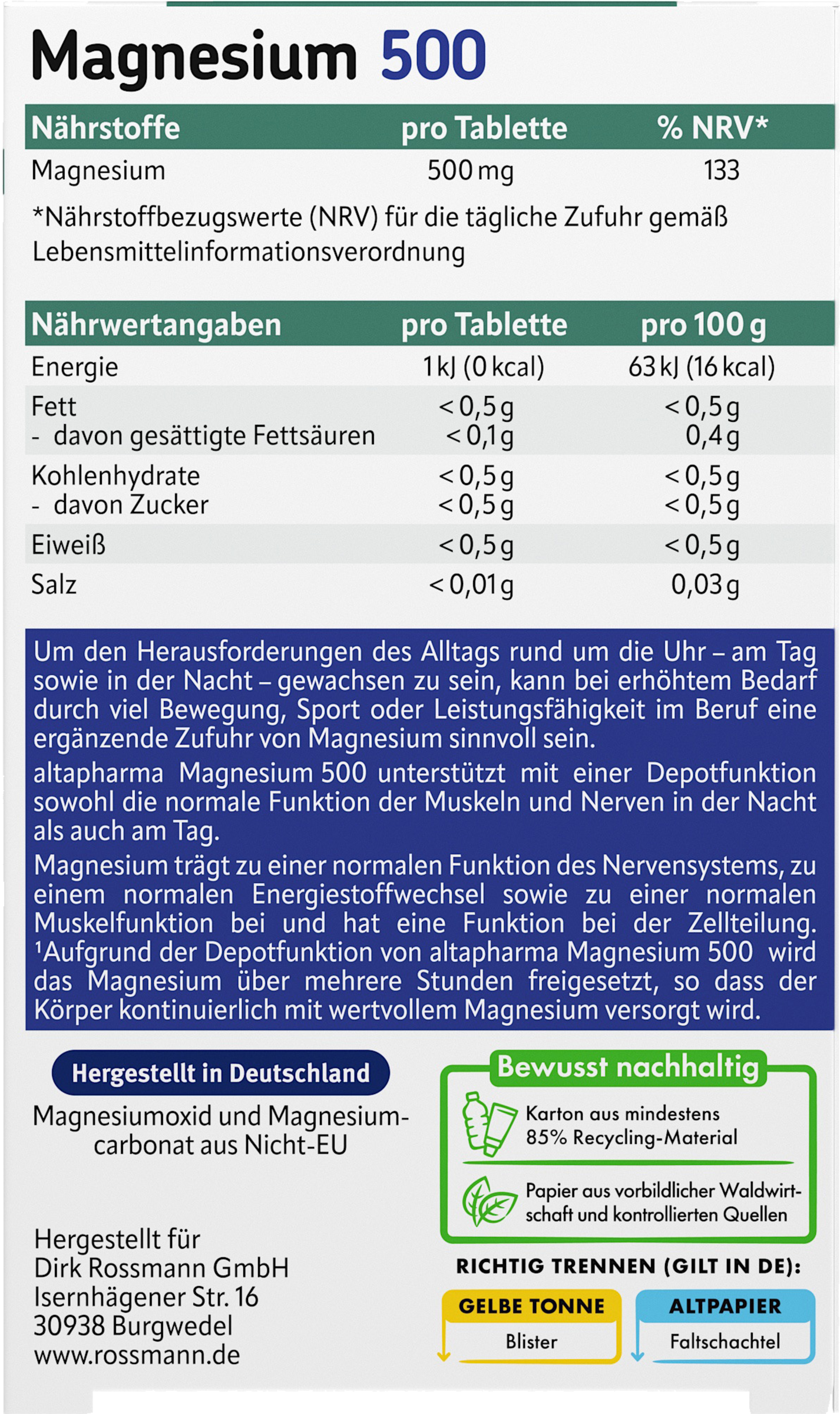 *Magnesium trägt zu einer normalen Funktion des Nervensystems, zu einem normalen Energiestoffwechsel sowie zu einer normalen Muskelfunktion bei und hat eine Funktion bei der Zellteilung. *Aufgrund der Depotfunktion von altapharma Magnesium 500 Depot wird das Magnesium über mehrere Stunden freigesetzt, so dass der Körper kontinuierlich mit wertvollem Magnesium versorgt wird.