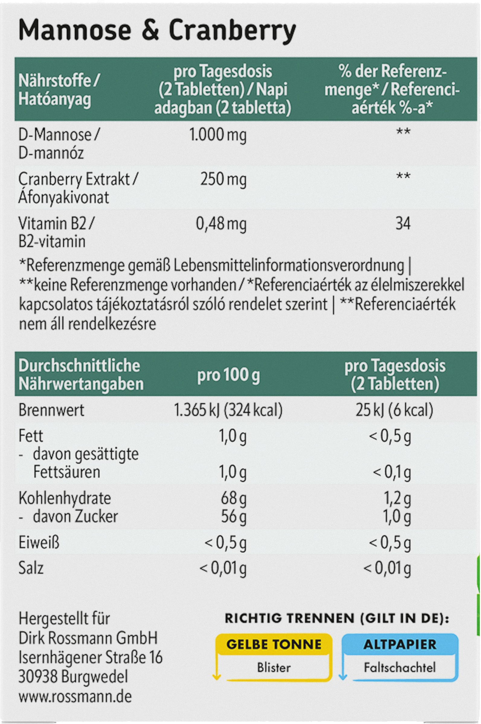 - Mannose 1.000 mg pro Tag