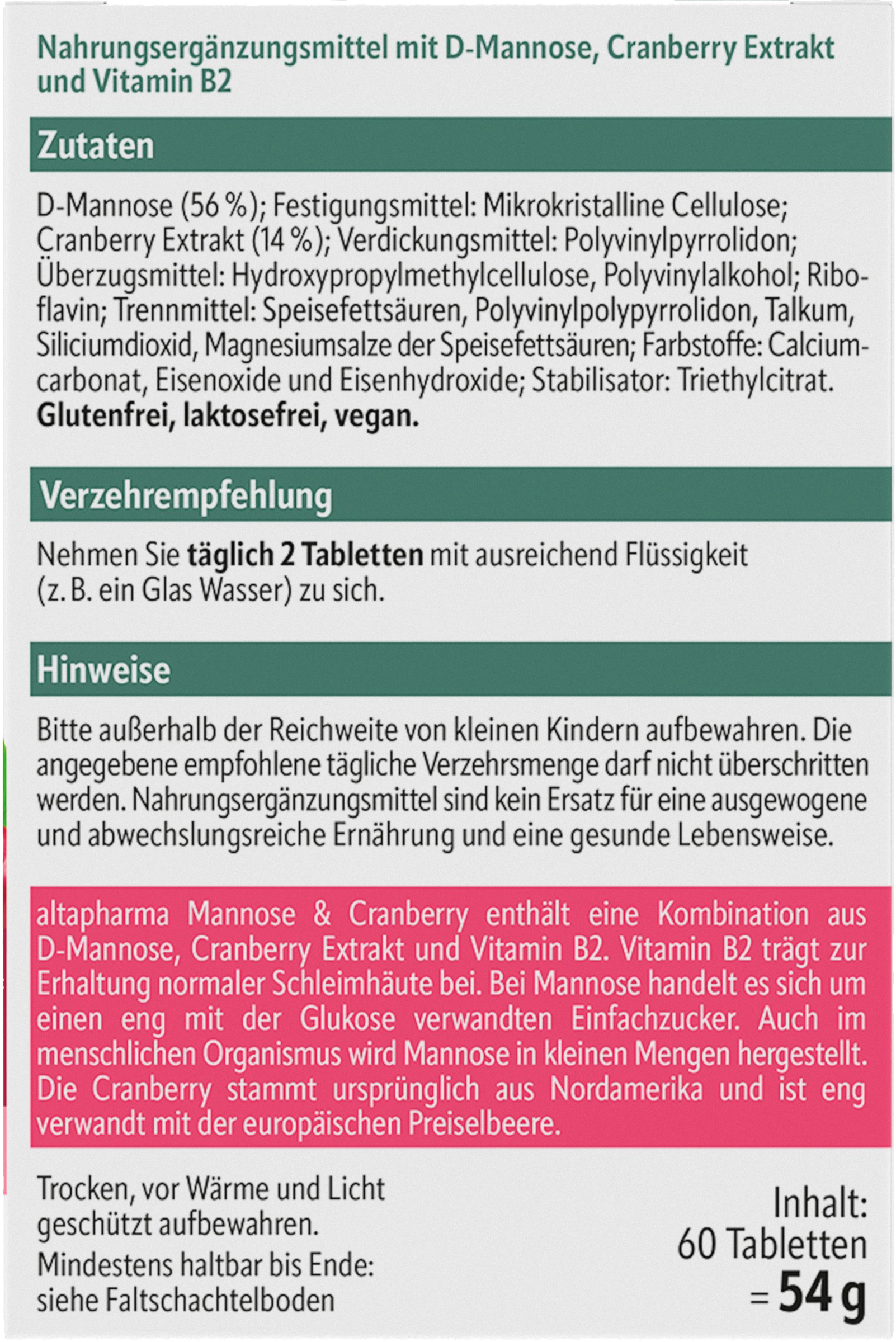 Die Tabletten enthalten eine Kombination aus Mannose, Cranberry-Extrakt und Vitamin B2. Mannose ist ein mit der Glukose verwandter Einfachzucker, der in geringen Mengen auch im menschlichen Organismus hergestellt wird. Dort kleidet Mannose u. a. die Innenwand der Harnblase und -wege aus. Die Cranberry stammt ursprünglich aus Nordamerika und ist eng verwandt mit der europäischen Preiselbeere. Schon vor Jahrhunderten war sie ein bedeutendes Nahrungsmittel bei den Ureinwohnern Nordamerikas. Das enthaltene Riboflavin, auch bekannt als Vitamin B2, trägt zur Erhaltung normaler Schleimhäute bei.