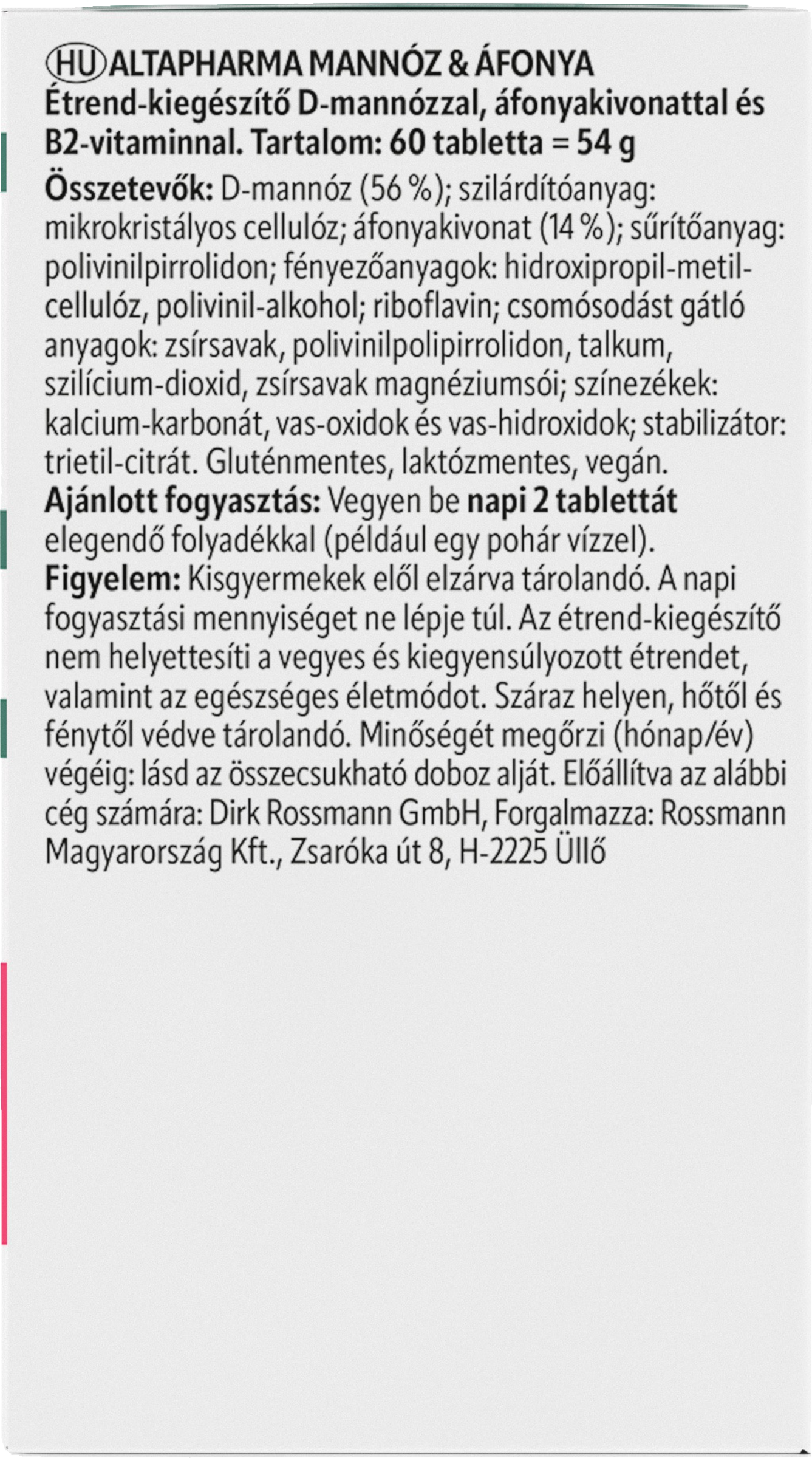 D-Mannose; Füllstoff (Cellulose); Cranberry-Extrakt; Überzug (Hydroxypropylmethylcellulose, Talkum, Polydextrose, Polyvinylalkohol, Eisenoxid); Trennmittel (Magnesiumstearat, Siliciumdioxid); Riboflavin.
