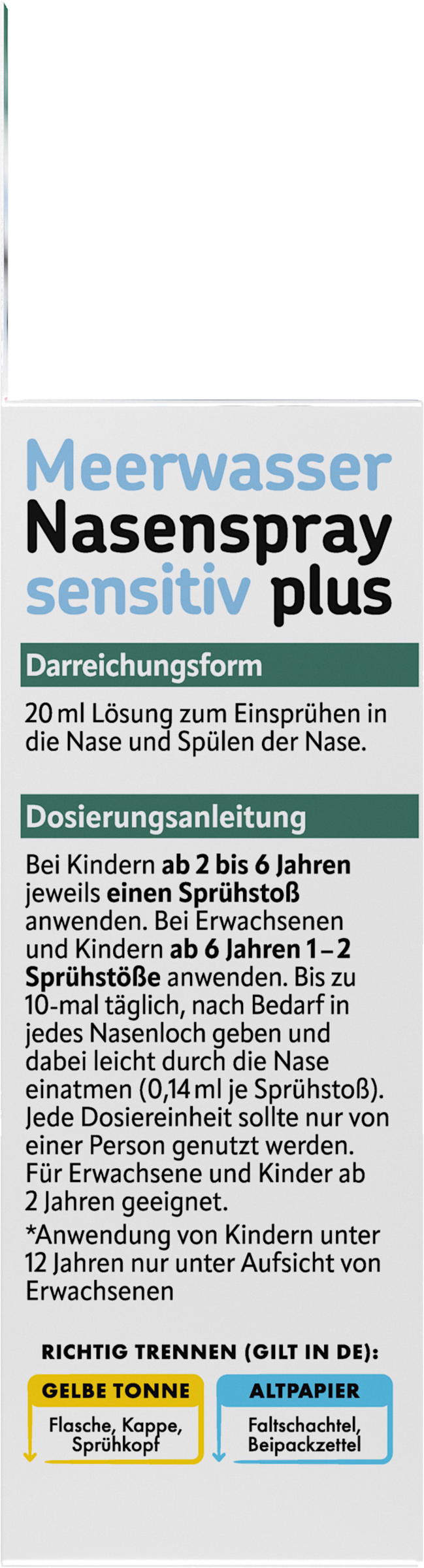 Bei Kindern ab 2 bis 6 Jahren jeweils einen Sprühstoß anwenden. Bei Erwachsenen und Kindern ab 6 Jahren 1 – 2 Sprühstöße anwenden. Bis zu 10 mal täglich, nach Bedarf in jedes Nasenloch geben und dabei leicht durch die Nase einatmen (0,14 ml je Sprühstoß). Jede Dosiereinheit sollte nur von einer Person genutzt werden. Für Erwachsene und Kinder ab 2 Jahren geeignet.