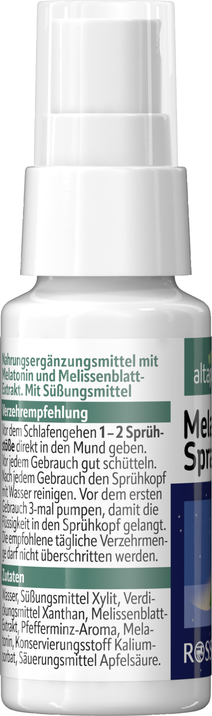Melatonin ist ein körpereigenes Hormon, das dazu beiträgt, abends müde zu werden. Die Produktion kann beispielsweise durch Stress, Jetlag oder hormonelle Veränderungen gestört werden. Altapharma Melatonin Spray trägt mit seinem Inhaltstoff Melatonin gezielt dazu bei, die Einschlafzeit zu verkürzen. Die Rezeptur des Sprays ist mit wertvollem Melissenextrakt angereichert und ist aufgrund seines Sprühmechanismus individuell dosierbar. Altapharma Melatonin Spray mit Pfefferminz-Geschmack unterstützt eine erholsame Nacht*, die einen leistungsfähigen Start in den Tag ermöglicht.