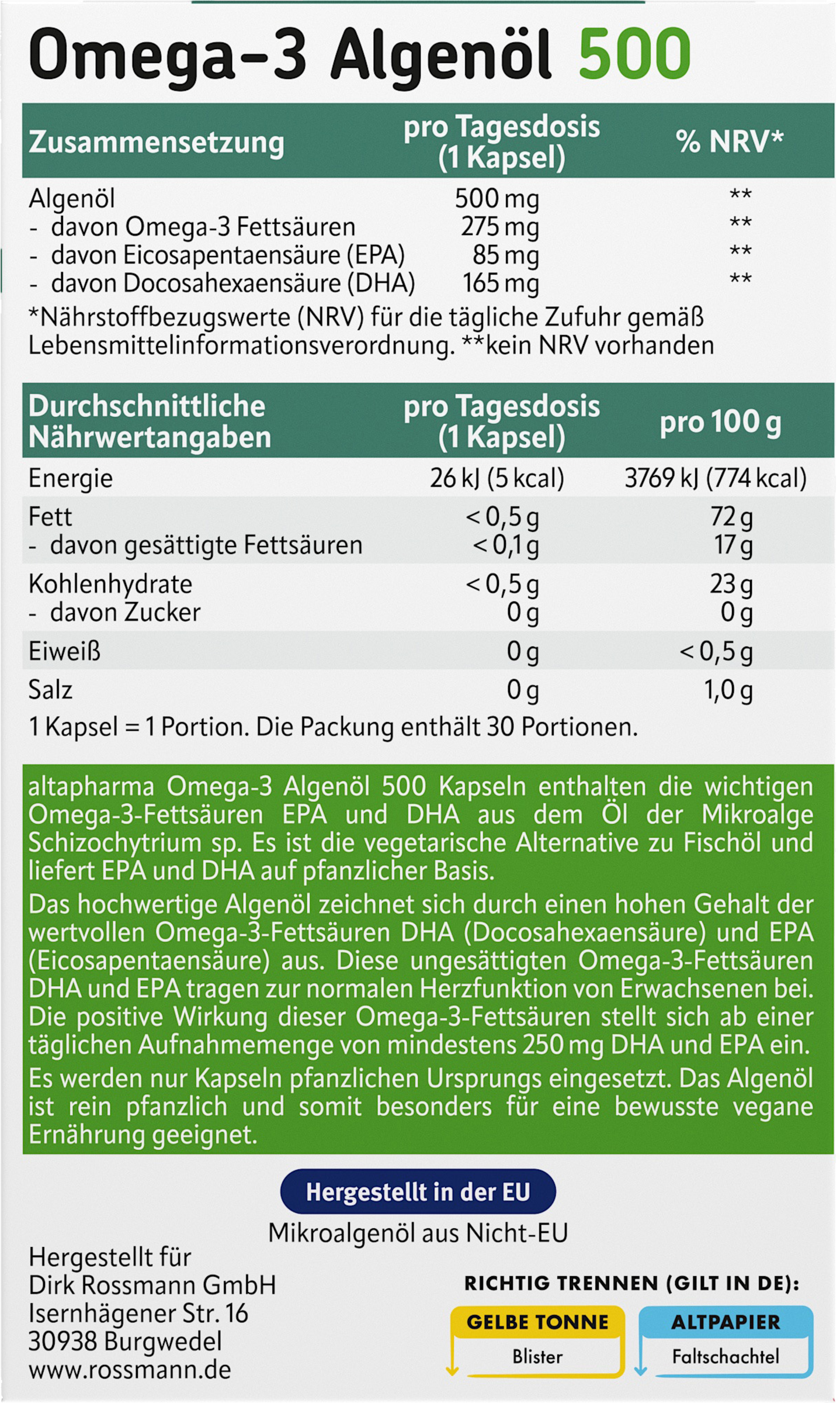 Altapharma Omega-3 Algenöl Kapseln enthalten die wichtigen Omega-3- Fettsäuren EPA und DHA aus dem Öl der Mikroalge Schizochytrium sp. Es ist die vegetarische Alternative zu Fischöl und liefert EPA und DHA auf pflanzlicher Basis. Das hochwertige Algenöl zeichnet sich durch einen hohen Gehalt der wertvollen Omega-3-Fettsäuren DHA (Docosahexaensäure) und EPA (Eicosapentaensäure) aus. Diese ungesättigten Omega-3-Fettsäuren DHA und EPA tragen zur normalen Herzfunktion von Erwachsenen bei. Die positive Wirkung dieser Omega-3-Fettsäuren stellt sich ab einer täglichen Aufnahmemenge von mindestens 250mg DHA und EPA ein. Es werden nur Kapseln pflanzlichen Ursprungs eingesetzt. Das Algenöl ist rein pflanzlich und somit besonders für eine bewusste vegane Ernährung geeignet.