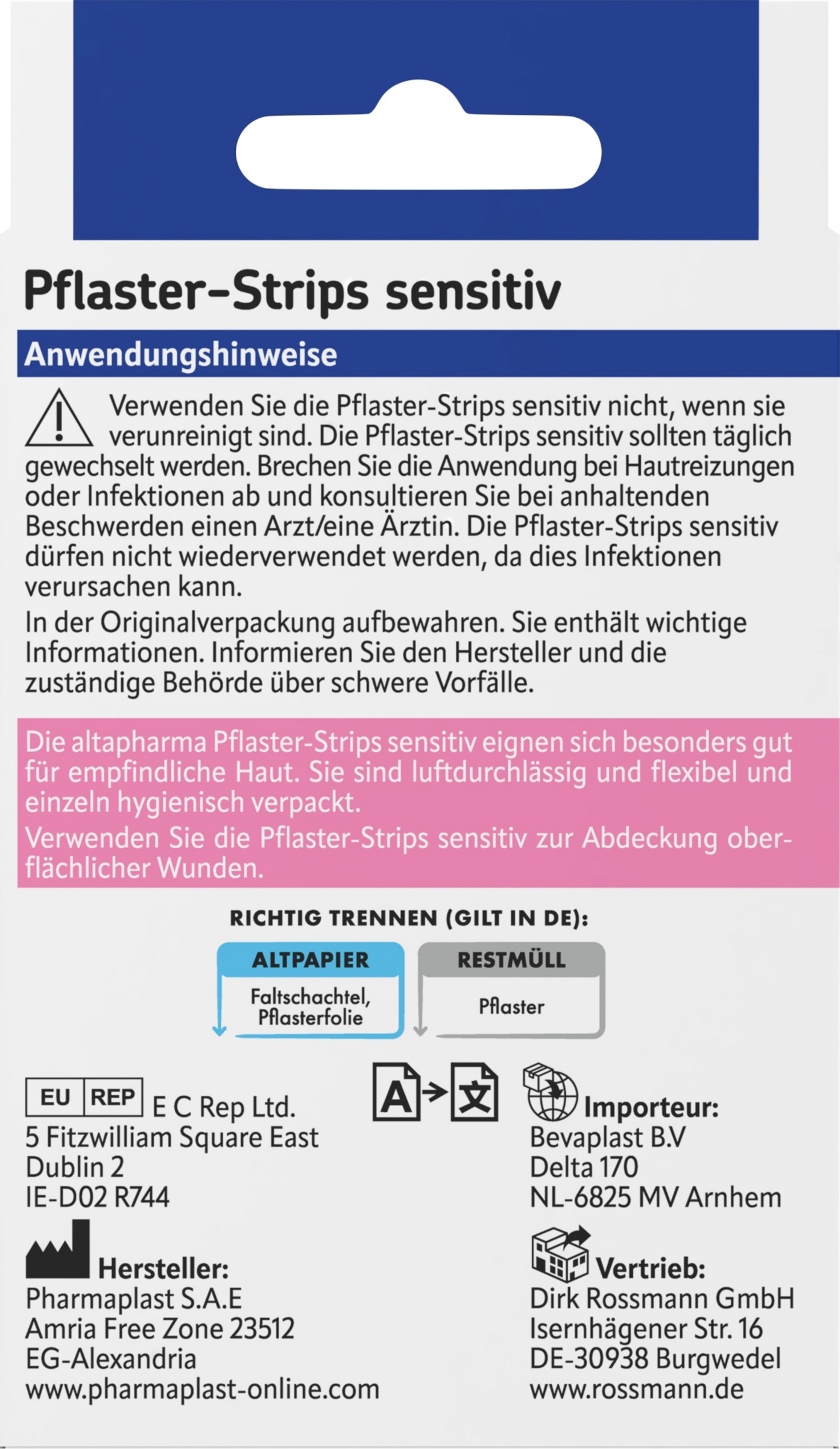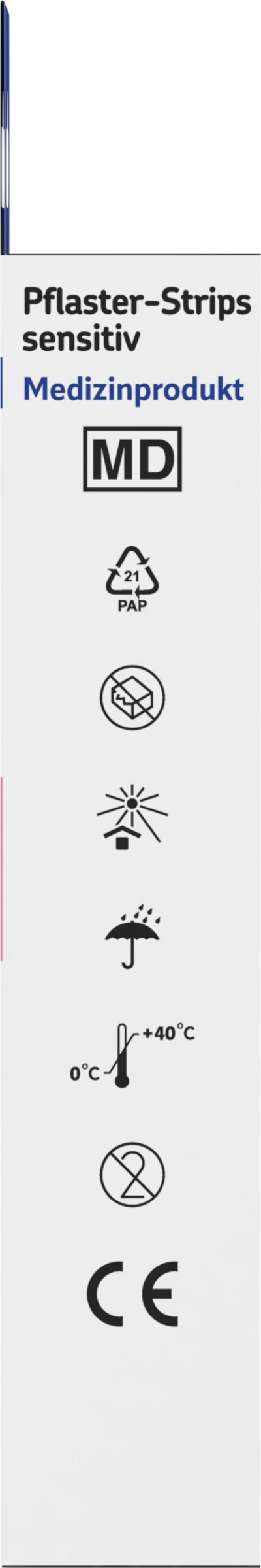 Verwenden Sie die Pflaster-Strips sensitiv nicht, wenn sie verunreinigt sind. Die Pflaster-Strips sensitiv sollten täglich gewechselt werden. Brechen Sie die Anwendung bei Hautreizungen oder Infektionen ab und konsultieren Sie bei anhaltenden Beschwerden einen Arzt/eine Ärztin. Die Pflaster-Strips sensitiv dürfen nicht wiederverwendet werden, da dies Infektionen verursachen kann.