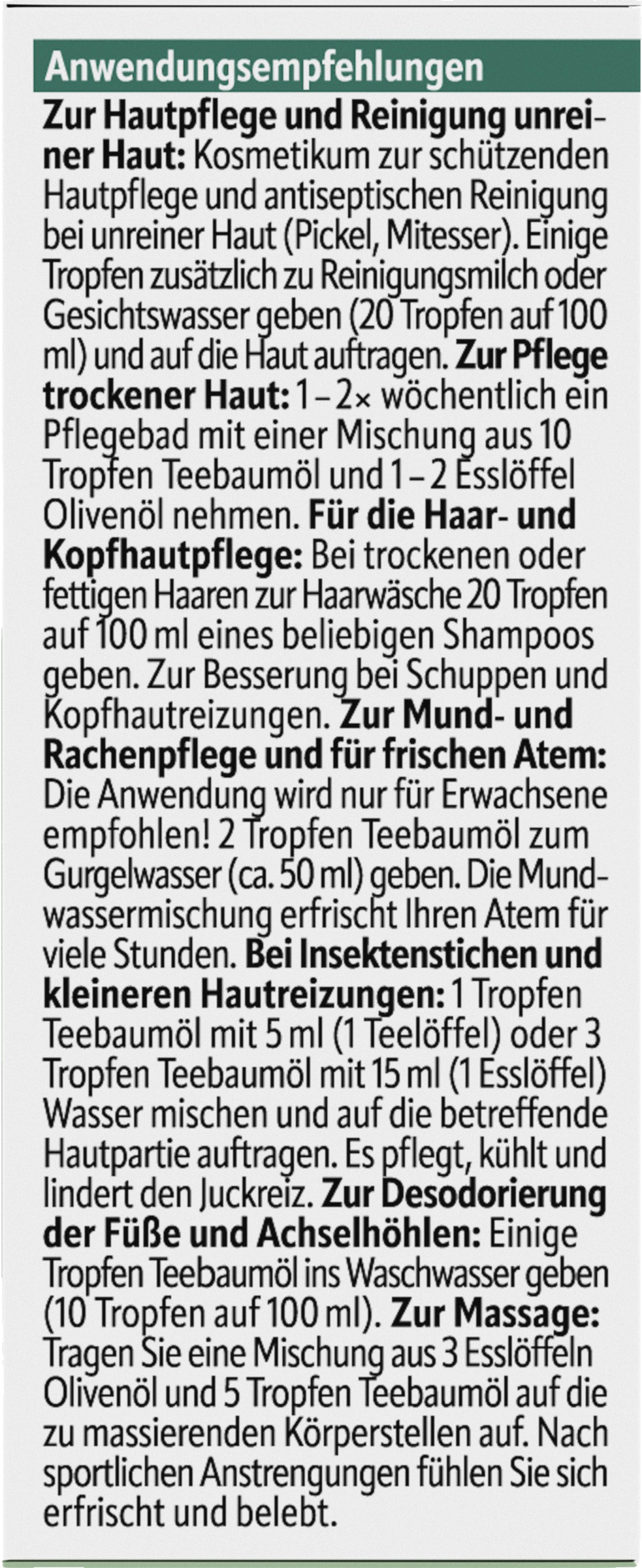 Bei Insektenstichen und kleineren Hautreizungen: 1 Tropfen Teebaumöl mit 5 ml (1 Teelöffel) oder 3 Tropfen Teebaumöl mit 15 ml (1 Esslöffel) Wasser mischen und auf die betreffende Hautpartie auftragen. Es pflegt, kühlt und lindert den Juckreiz.