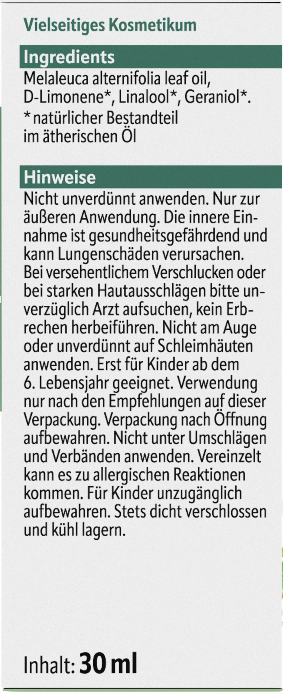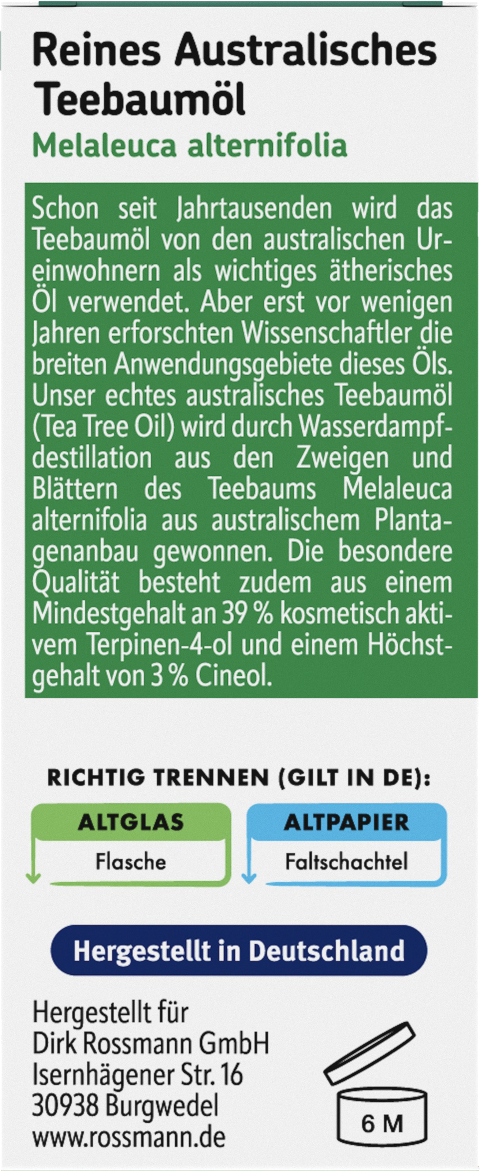 Schon seit Jahrtausenden wird das Teebaumöl von den australischen Ureinwohnern als wichtiges ätherisches Öl verwendet. Aber erst vor wenigenJahren erforschten Wissenschaftler die breiten Anwendungsgebiete dieses Öls.Unser echtes australisches Teebaumöl (Tea Tree Oil) wird durch Wasserdampfdestillation aus den Zweigen und Blättern des Teebaums Melaleucaalternifolia aus australischem Plantagenanbau gewonnen. Die besondere Qualität besteht zudem aus einem Mindestgehalt an 39 % kosmetisch aktivem Terpinen-4-ol und einem Höchstgehalt von 3 % Cineol.