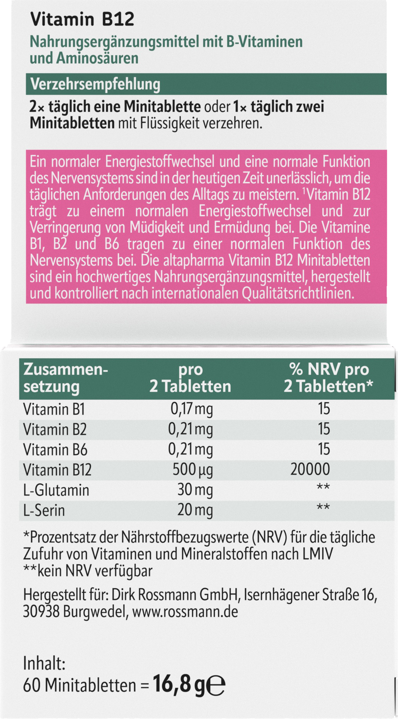 Ein normaler Energiestoffwechsel und eine normale Funktion des Nervensystems sind in der heutigen Zeit unerlässlich, um die täglichen Anforderungen des Alltags zu meistern. Vitamin B12 trägt zu einem normalen Energiestoffwechsel und zur Verringerung von Müdigkeit und Ermüdung bei. Die Vitamine B1, B2 und B6 tragen zu einer normalen Funktion des Nervensystems bei. Die altapharma Vitamin B12 Minitabletten gestellt sind ein hochwertiges Nahrungsergänzungsmittel, her und kontrolliert nach internationalen Qualitätsrichtlinien.