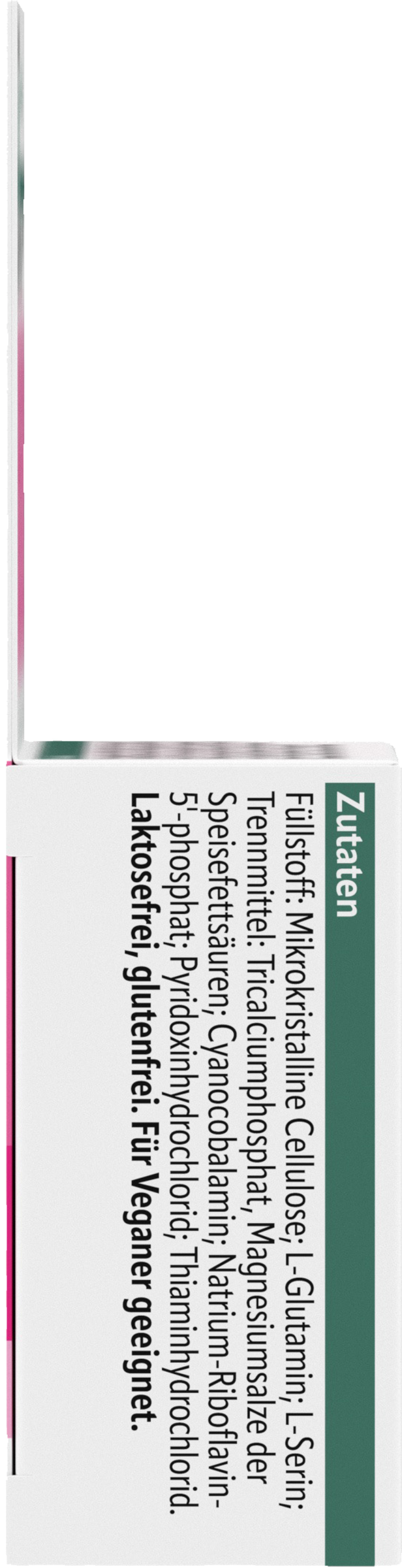 Füllstoff: Mikrokristalline Cellulose; L-Glutamin; Füllstoff: Polyvinylpyrrolidon; L-Serin, Trennmittel: Tricalciumphsophat, Siliciumdioxid, Magnesiumsalze der Speisefettsäuren; Cyanocobalamin; Riboflavin-5-phosphat, Natrium; Pyridoxinhydrochlorid; Thiaminhydrochlorid. Laktosefrei, glutenfrei. Für Veganer geeignet.