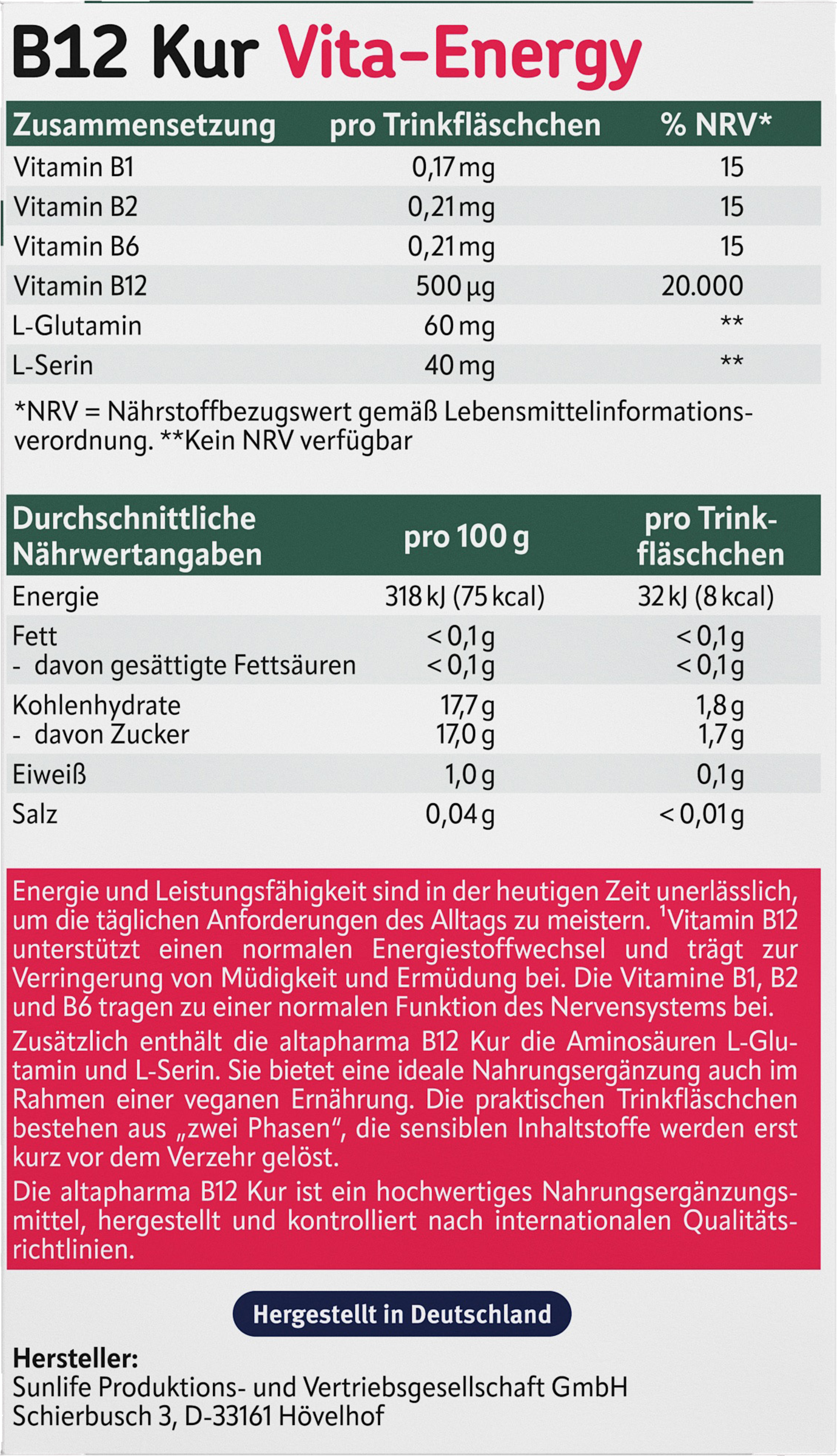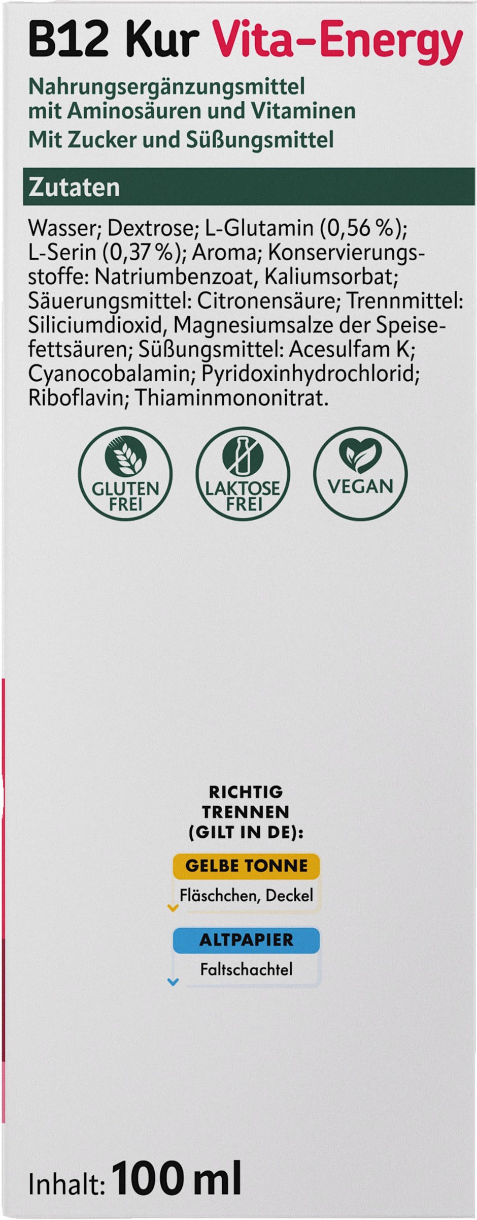 Wasser; Dextrose; L-Glutamin (0,56%); L-Serin (0,37%); Aroma; Konservierungsstoffe: Natriumbenzoat; Kaliumsorbat; Säuerungsmittel: Citronensäure; Trennmittel: Siliciumdioxid, Magnesiumsalze der Speisefettsäuren; Süßungsmittel: Acesulfam K; Cyanocobalamin; Pyridoxinhydrochlorid; Riboflavin; Thiaminmonocitrat.
