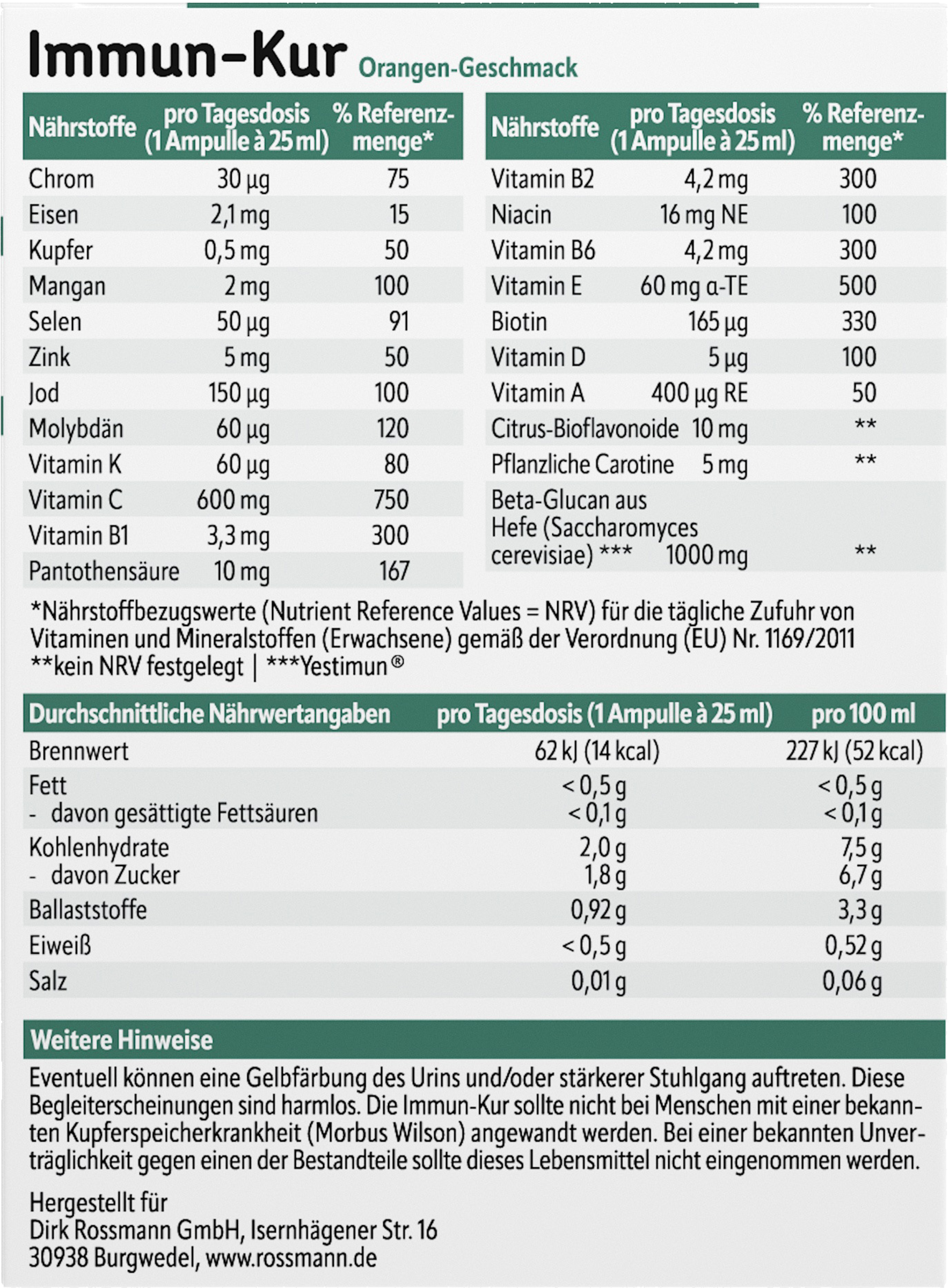 - Immun-Kur Ampullen: Wasser, Orangensaftkonzentrat, Beta-Glucan aus Hefe (Saccharomyces cerevisiae) (4%), Vitamin C, Fruktose, Vitamin E, Niacin, Verdickungsmittel: Xanthan, Konservierungsstoff: Kaliumsorbat und Natriumbenzoat, Zinkgluconat, Citrus-Bioflavonoide (0,04 %), pflanzliche Carotine (0,02 %), Eisen-(II)- gluconat, Biotin, Aroma Orange und Mirabelle, Calcium-D-pantothenat, Süßungsmittel: Natriumcyclamat, Sucralose, Natriumsaccharin und Neohesperidin DC, Mangansulfat, Vitamin B6, Vitamin B1, Vitamin B2, Kupfergluconat, Vitamin A, Kaliumiodid, Natriumselenit, Chrom-(III)-chlorid, Natriummolybdat, Vitamin K1, Vitamin D3.