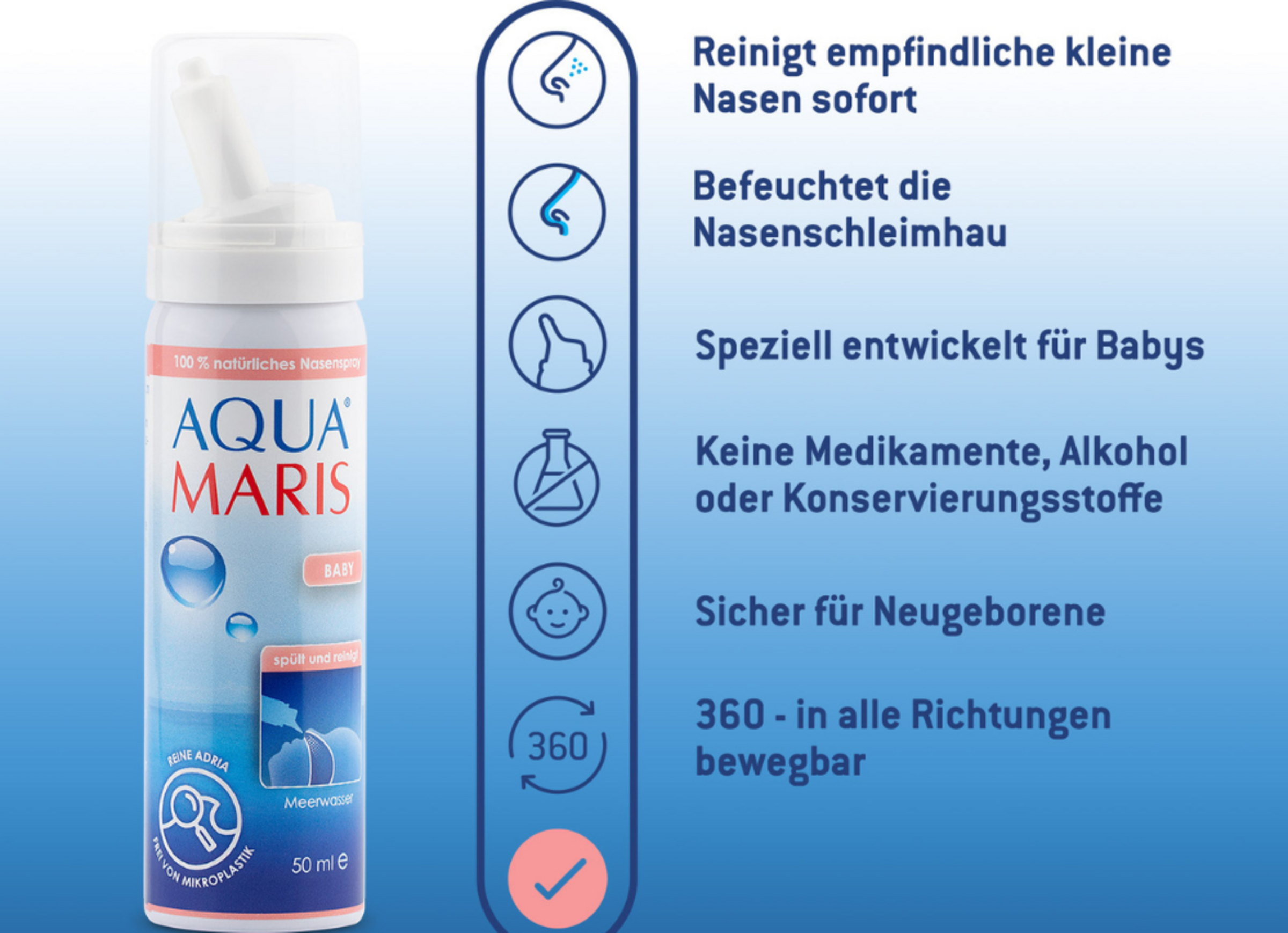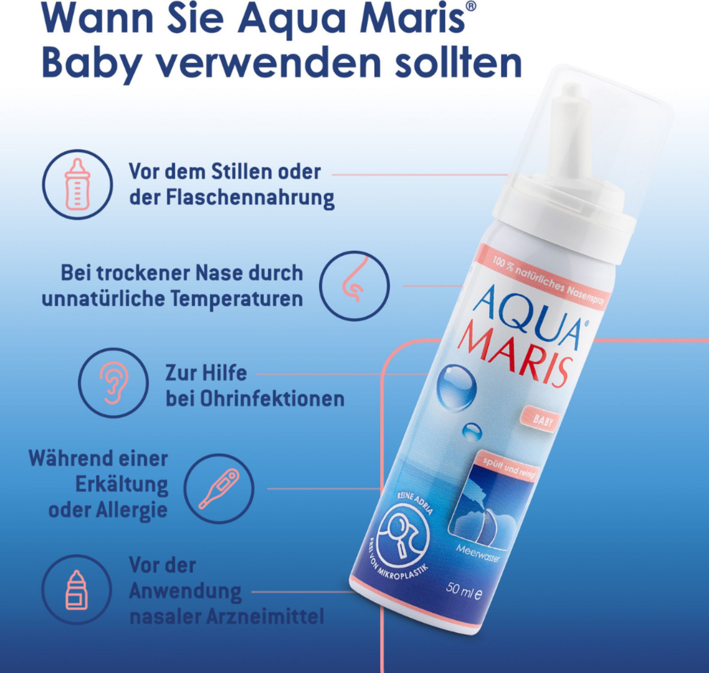 Sprühen Sie das Aqua Maris® Baby 2- bis 6-mal täglich in jedes Nasenloch – bei Bedarf auch öfter. Nach dem Auftragen den Applikator ausspülen und trocknen. Zum Lösen und Entfernen größerer Mengen von Verunreinigungen und Sekret aus der Nasenhöhle sprühen Sie eine größere Menge Aqua Maris® Baby in jedes Nasenloch. Der Vorgang kann wiederholt werden, bis der Inhalt weich genug ist, um leicht aus der Nase entfernt zu werden.
