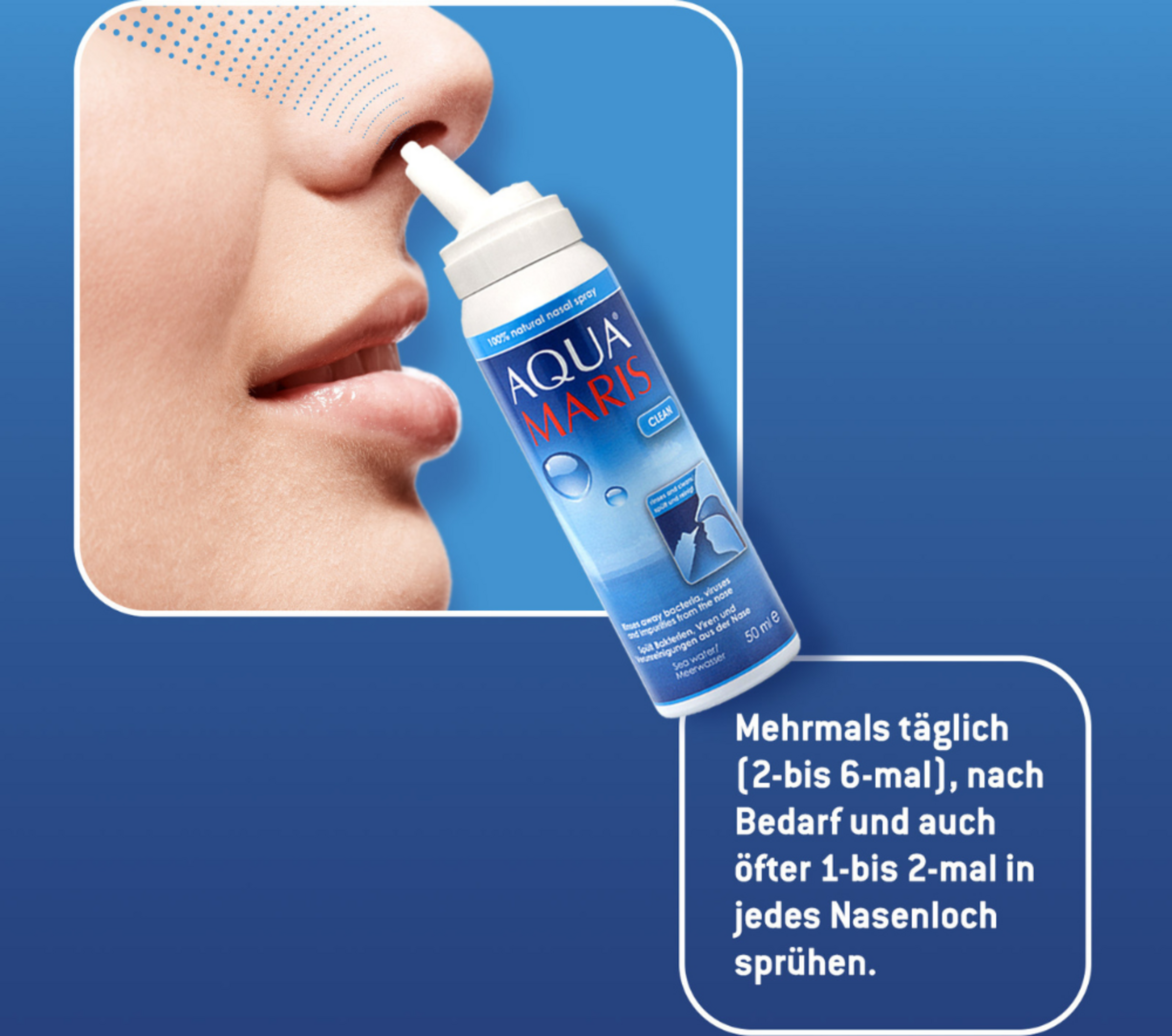Sprühen Sie das Aqua Maris® Clean 1- bis 2-mal in jedes Nasenloch, mehrmals täglich (2- bis 6-mal) oder bei Bedarf auch öfter. Nach dem Auftragen den Applikator ausspülen und trocknen.